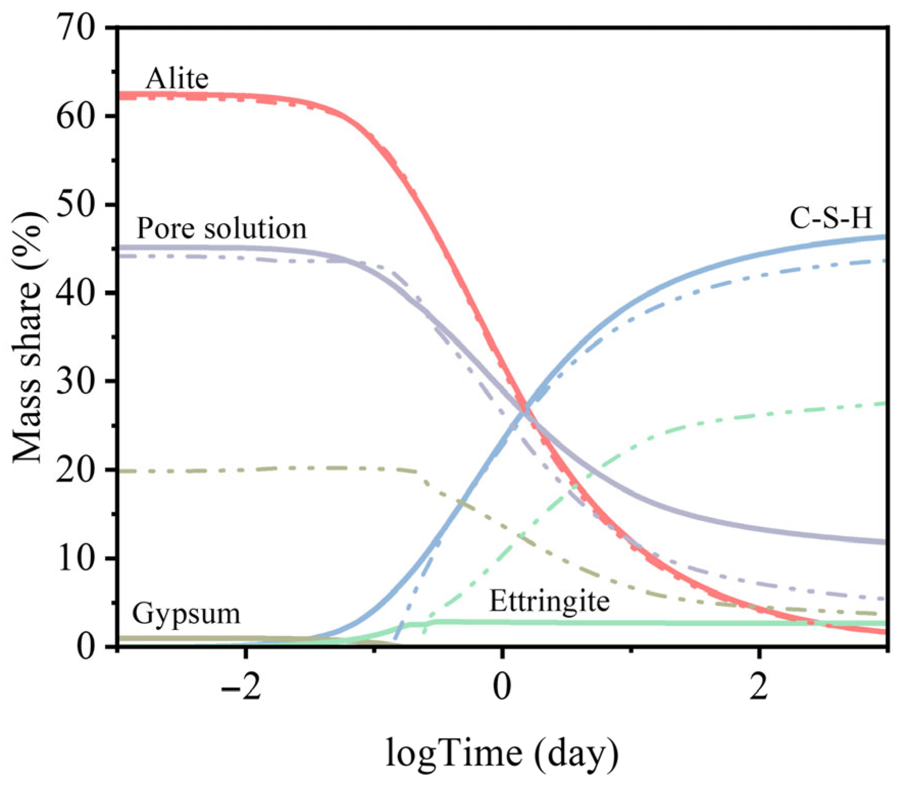 Figure 10. Thermodynamic model of the setting mechanism for mixtures containing reference (solid line) and recycled (dash–dot line) aggregates. Based on the differences in the evolution of C–S–H, gypsum, ettringite, and the pore solution, the model successfully predicts the influence of heavy metals on the initial setting time.