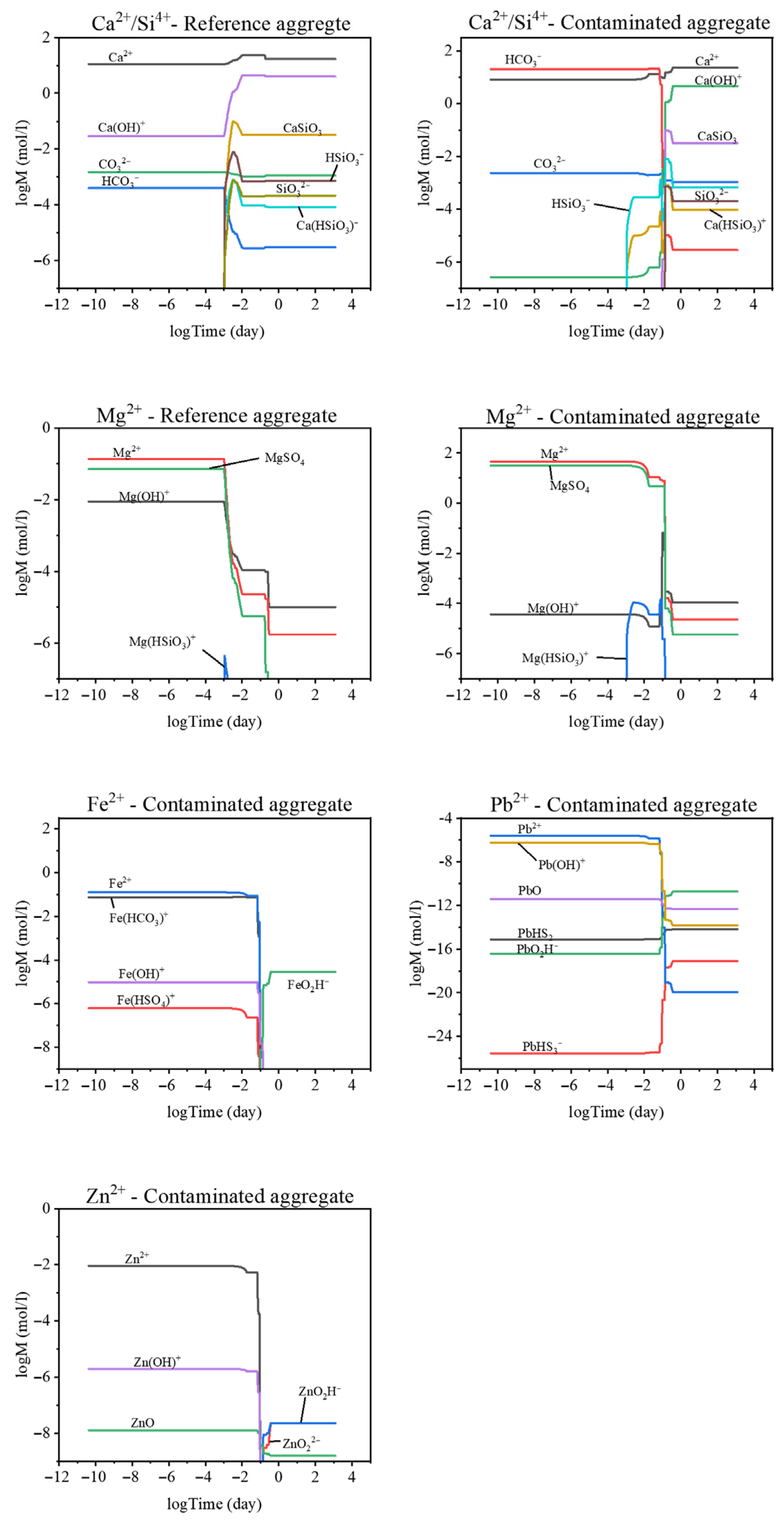 The thermodynamic model has certain limitations, particularly regarding the accuracy of the predicted product concentrations. Nevertheless, it also allows the prediction of ionic species present in the pore solution, which, at higher concentrations, may lead to the crystallization of new phases or reactions with other available species. This modeling approach provides deeper insight into the mechanisms occurring in cement composites incorporating heavy metal-contaminated recycled aggregate.