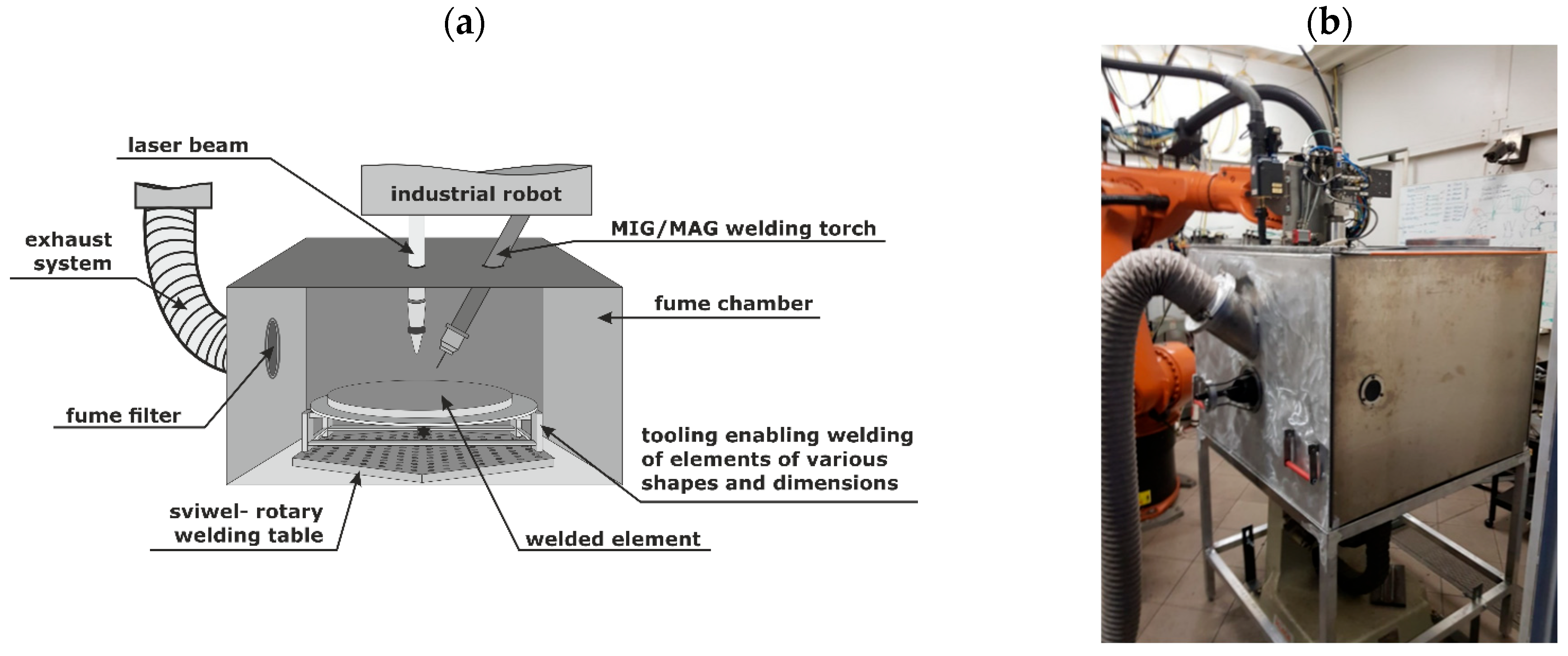 - Wyciślik-Sośnierz, J.; Matusiak, J. Analiza Wpływu Spawania Laserowego, Hybrydowego I Łukowego Stali Odpornych Na Korozję Na Emisję Pyłu Spawalniczego, Skład Chemiczny I Fazowy Oraz Jego Morfologię; Łukasiewicz-GIT Research Work No. SR/S0/B084/2024; Łukasiewicz-GIT: Gliwice, Poland, 2024. [Google Scholar]