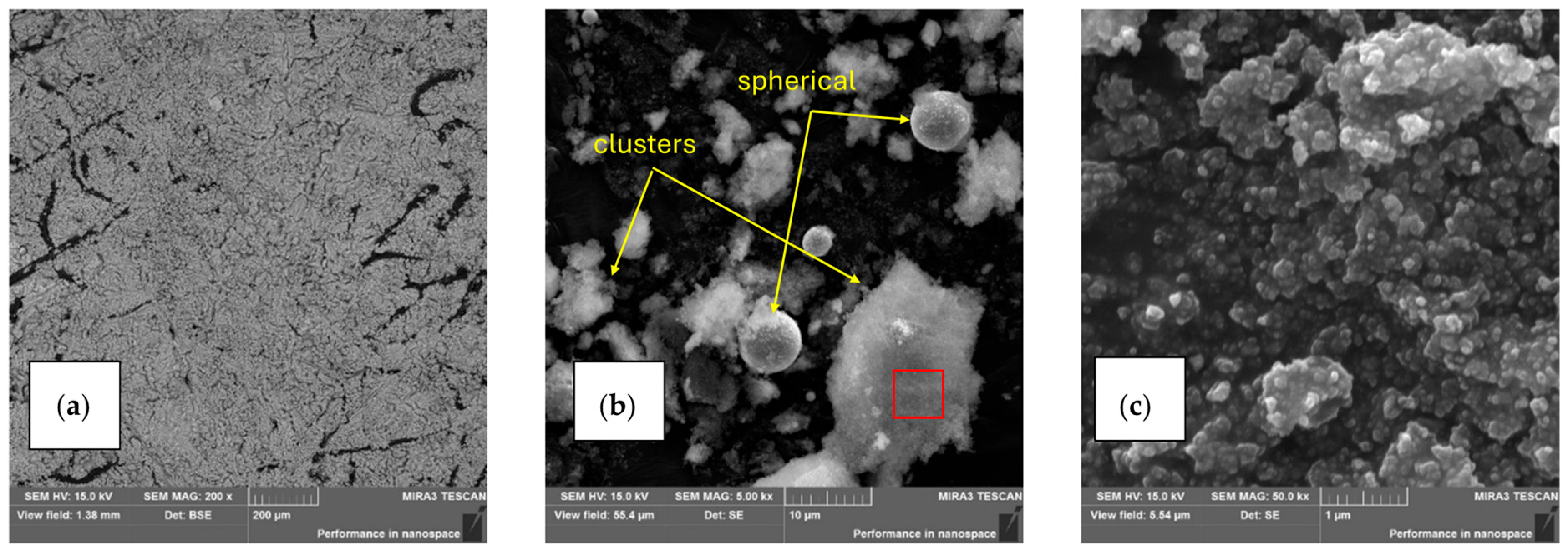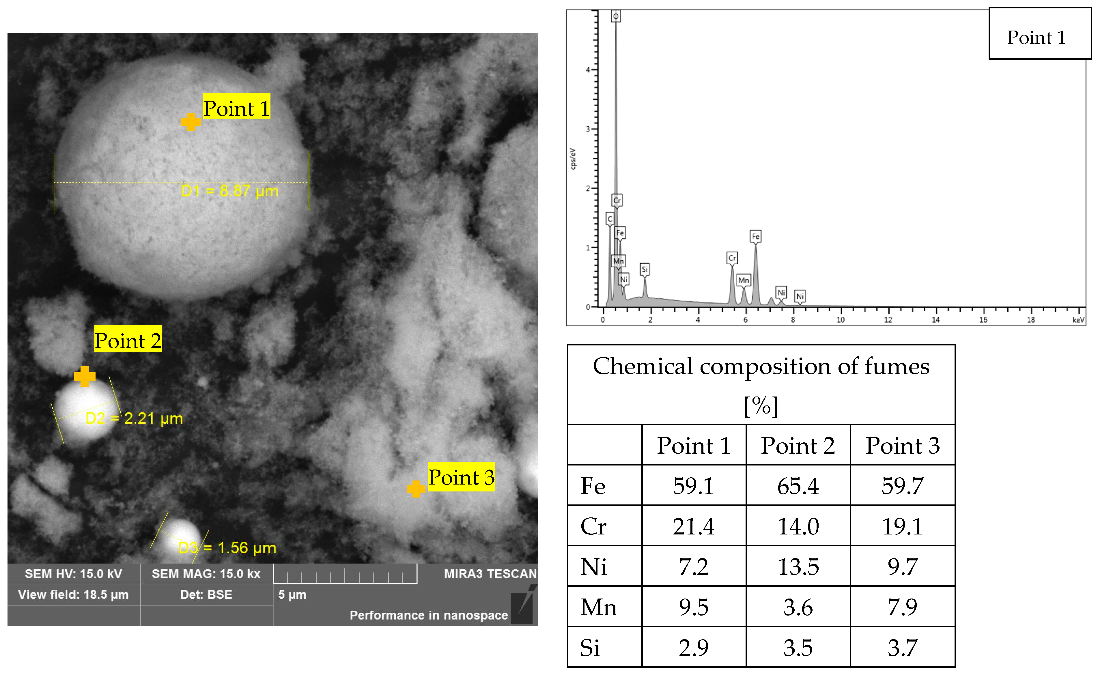 - Wyciślik-Sośnierz, J.; Matusiak, J.; Adamiec, J.; Urbańczyk, M.; Lemanowicz, M.; Kusiorowski, R.; Gerle, A. Morphology of Welding Fume Derived from Stainless Steel Arc Welding. Proceedings 2024, 108, 8. [Google Scholar] [CrossRef]
