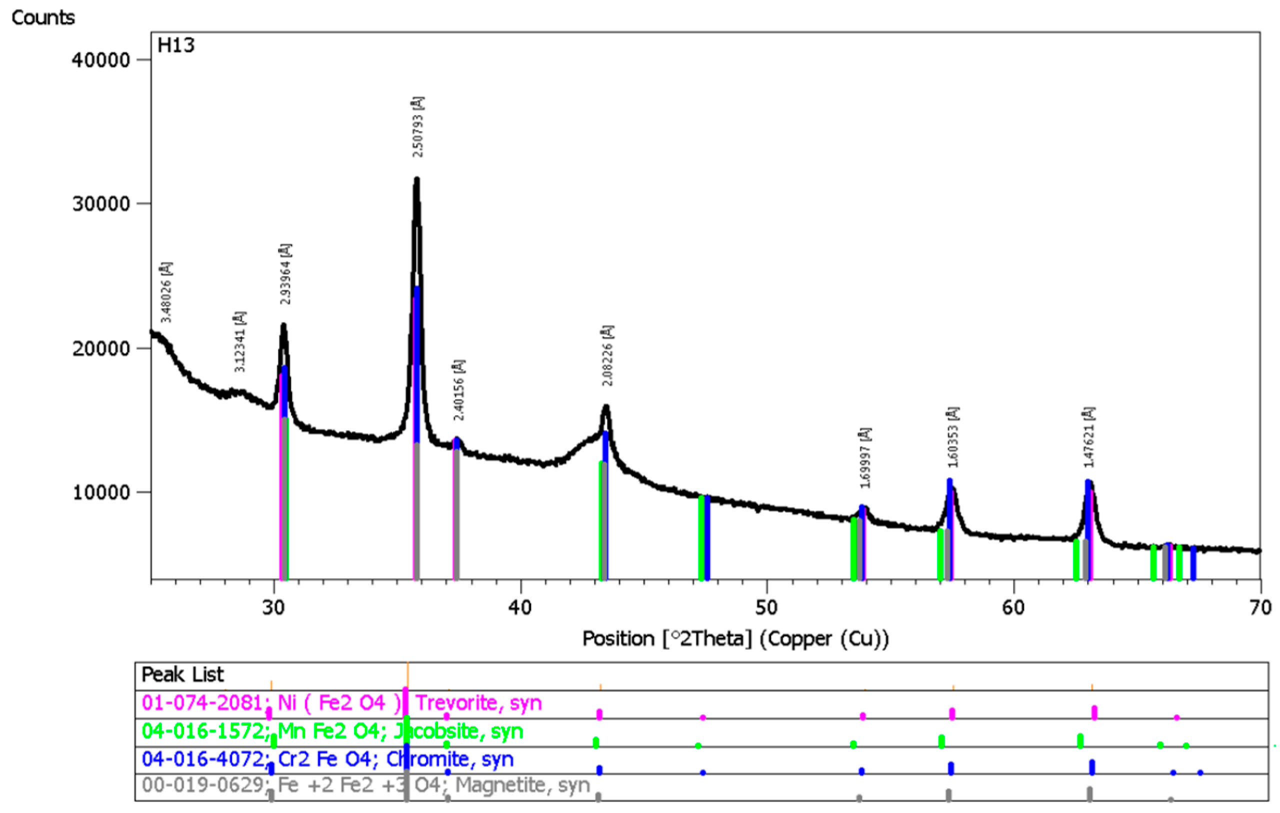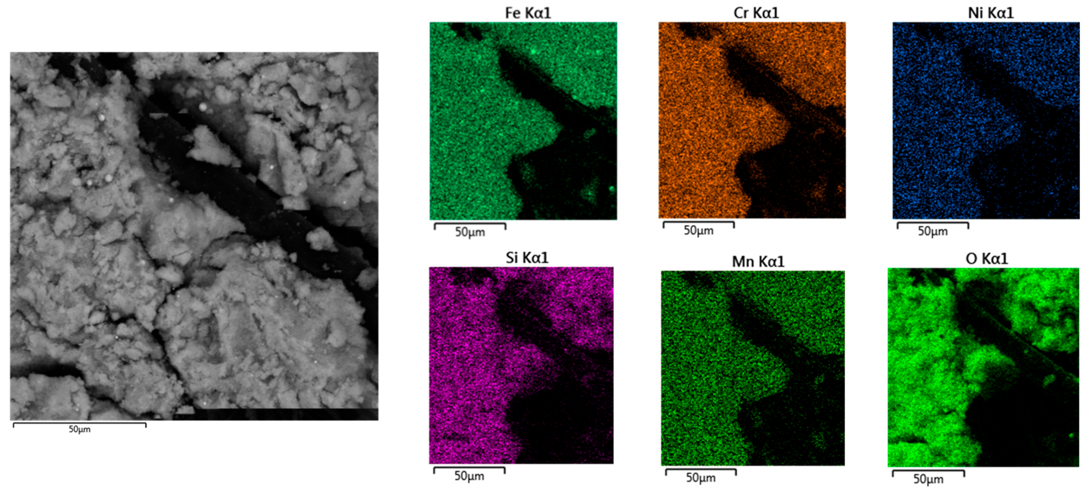 - Fumes emitted during the hybrid welding of 1.4301 stainless steel contained iron, chromium, nickel, manganese, and silicon. The presence of oxygen was also confirmed. X-ray diffraction (XRD) analysis revealed the following spinel phases: Cr2FeO4, MnFe2O4, NiFe2O4, and Fe3O4.