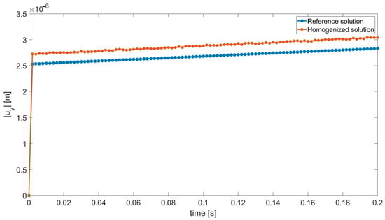 In this test, we extend the analysis to the viscoelasticity problem. The difference between the present and previous test is the fact that the mastic phase behaves as the Burgers material, which is in good agreement with laboratory experiments [34,35]. In this test, we simulate a single load impulse of duration equal to 0.2 s. Even such a short period of loading changes the response of the specimen (compare Figure 5 and Figure 6). A dominant vertical component exhibits maximum value observed in Figure 6, which is about 8.3% larger compared to the corresponding value observed in Figure 5.