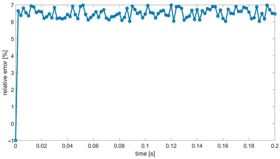 Another interesting observation can be made looking at Figure 8, where the corresponding error history plot is presented. By error, we mean the absolute value of the difference between the presented solutions at each time instance divided by the absolute value of the reference solution at the corresponding time instance. One can observe that the error oscillates; however, there is no accumulation of its value in time. It is a promising result, which confirms the stability of the developed approach.