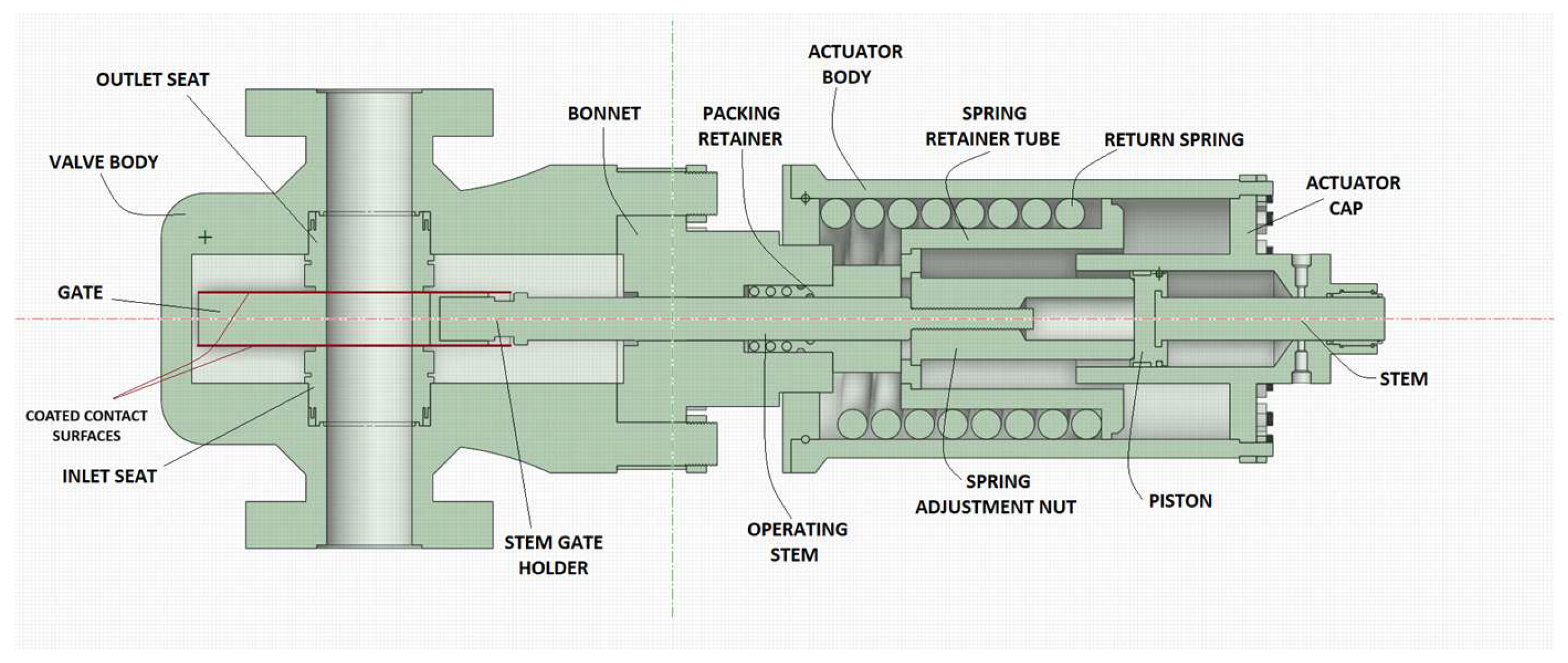Regarding the actuator part, the axial force required to move the gate is achieved through the piston–cylinder coupling. Hydraulic fluid from topside HPU enters the cylinder through the fluid inlet, generating force on the piston. A return spring, located between the piston retainer tube and the actuator body’s bonnet end, is compressed as the hydraulic fluid drives the piston to open the valve. The valve is kept open with the consistency of hydraulic pressure. In emergencies such as power failures, the return spring activates, moving the stem into a fail-safe position and closing the valve.