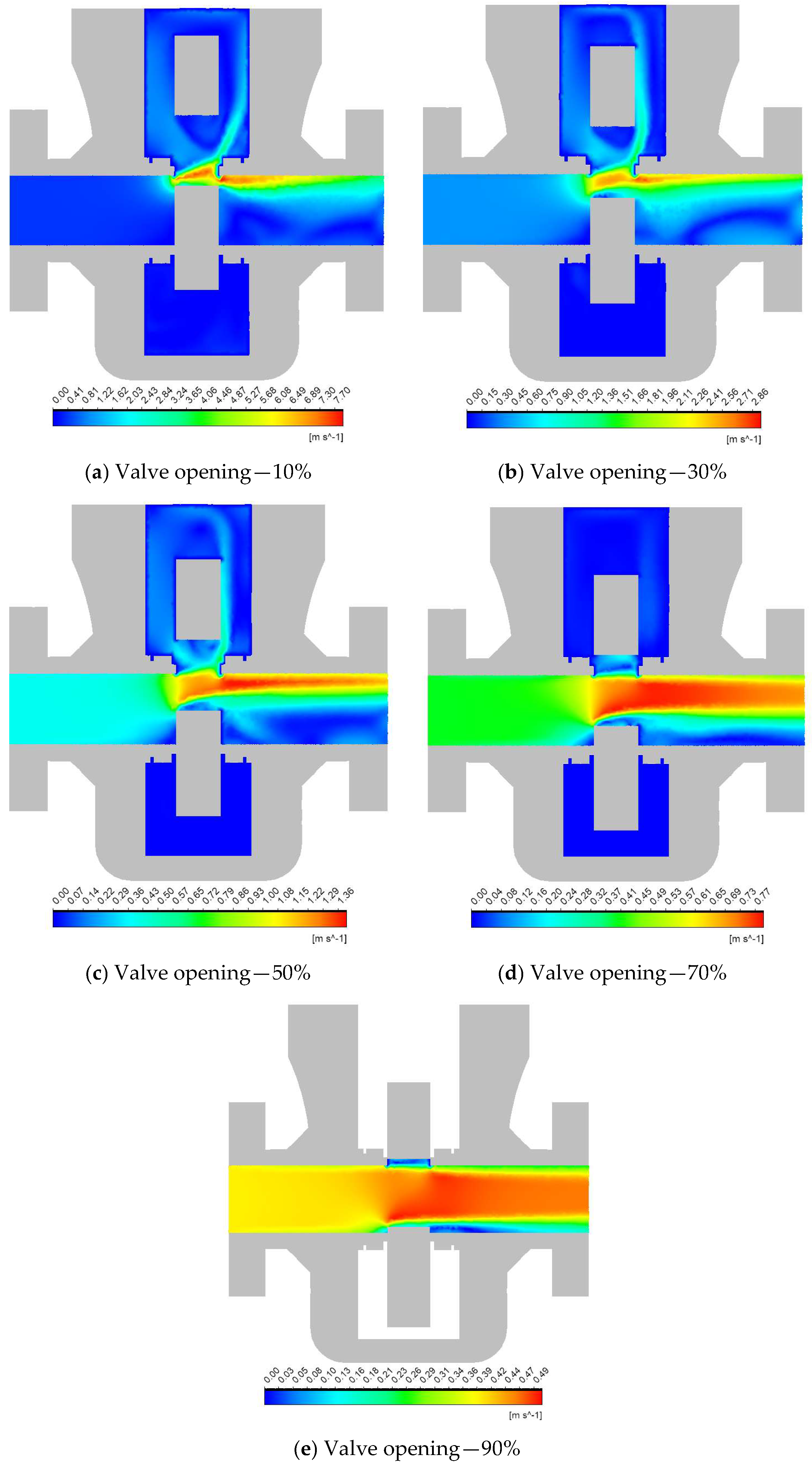 Starting with the narrower opening position, the flow reaches its maximum velocity of 7.8   m / s where it is highly restricted, resulting in a jetting effect, shown in Figure 2a. Due to internal wall resistivity and flow friction, the velocity drops through the internal wall. As the opening of the valve increases to 30 % , the velocity gradients begin to spread over a larger area, leading to a reduced flow velocity. Near the outlet valve seat, localized high-velocity ( 2.89   m / s ) can be observed as shown in Figure 2b.