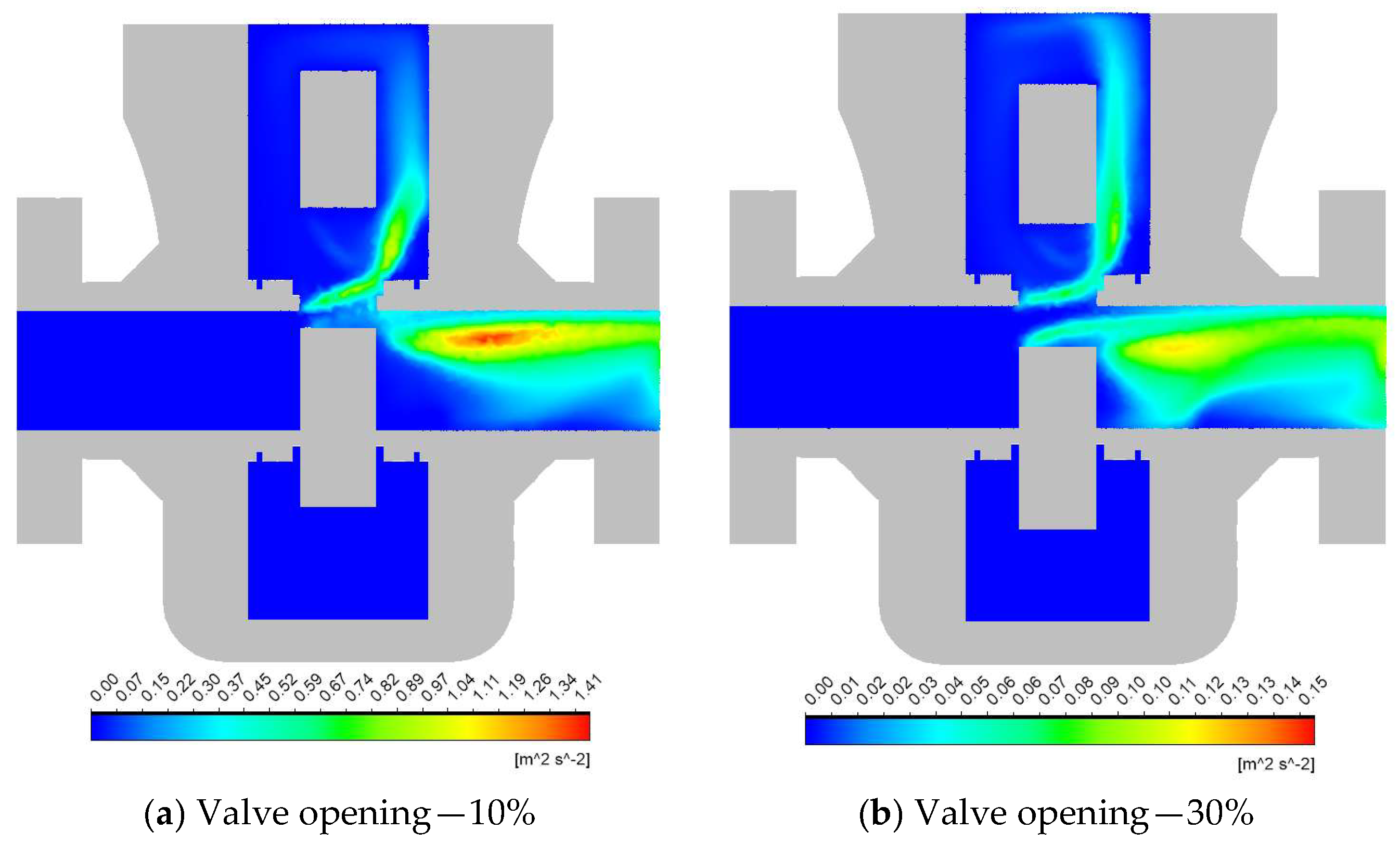 The change in the distribution of TKE during valve operation is shown in Figure 3. Comparing the TKE contours with the velocity figures, it is evident that narrow openings increase the molecular viscosity of the flow, and therefore, high TKE values are not observed where the flow velocity is maximum. Instead, intense TKE ( 1.44   m 2 / s 2 ) is concentrated in the downstream side of the gate. Additionally, one can notice that the TKE values decline faster due to wall resistance [42]. The rest of the flow area remains comparably stagnant with minimal turbulence generation (Figure 3a).