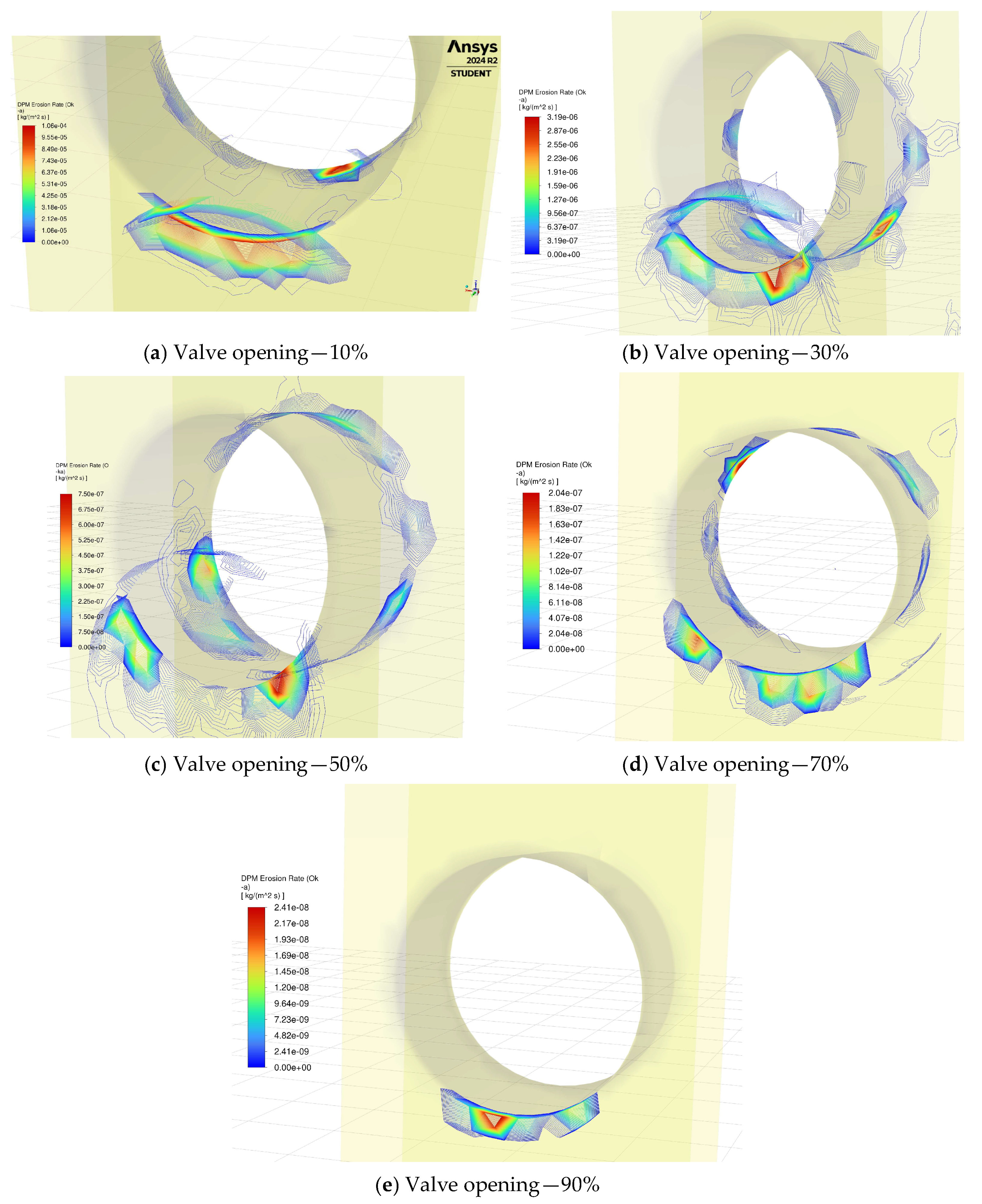 Figure 2 shows the velocity contours illustrating the flow distribution through the subsea gate valve at different openings. Comparing different valve positions confirms the expected decrease in flow velocity as the valve opens. Additionally, one can observe the high-velocity regions, recirculating zones, and flow impingement, which are contributing factors to the erosion severity and location [40,41].