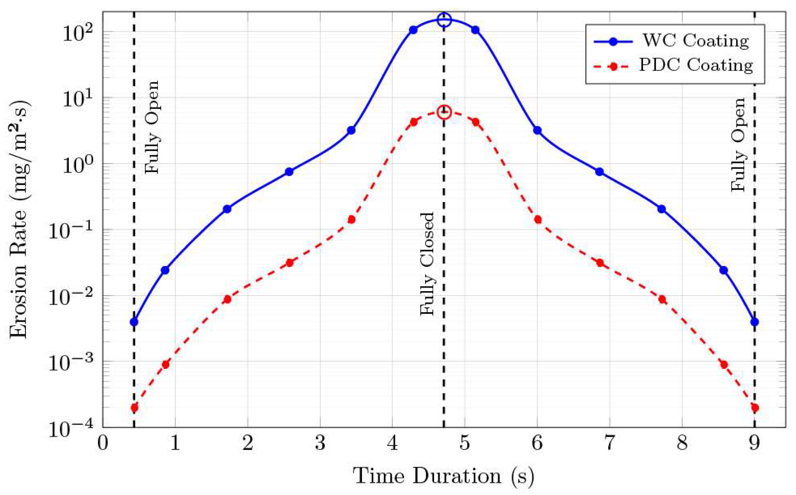 Figure 5. Erosion rate vs. time duration for one valve cycle (logarithmic y-axis). Fully open and fully closed positions are highlighted.