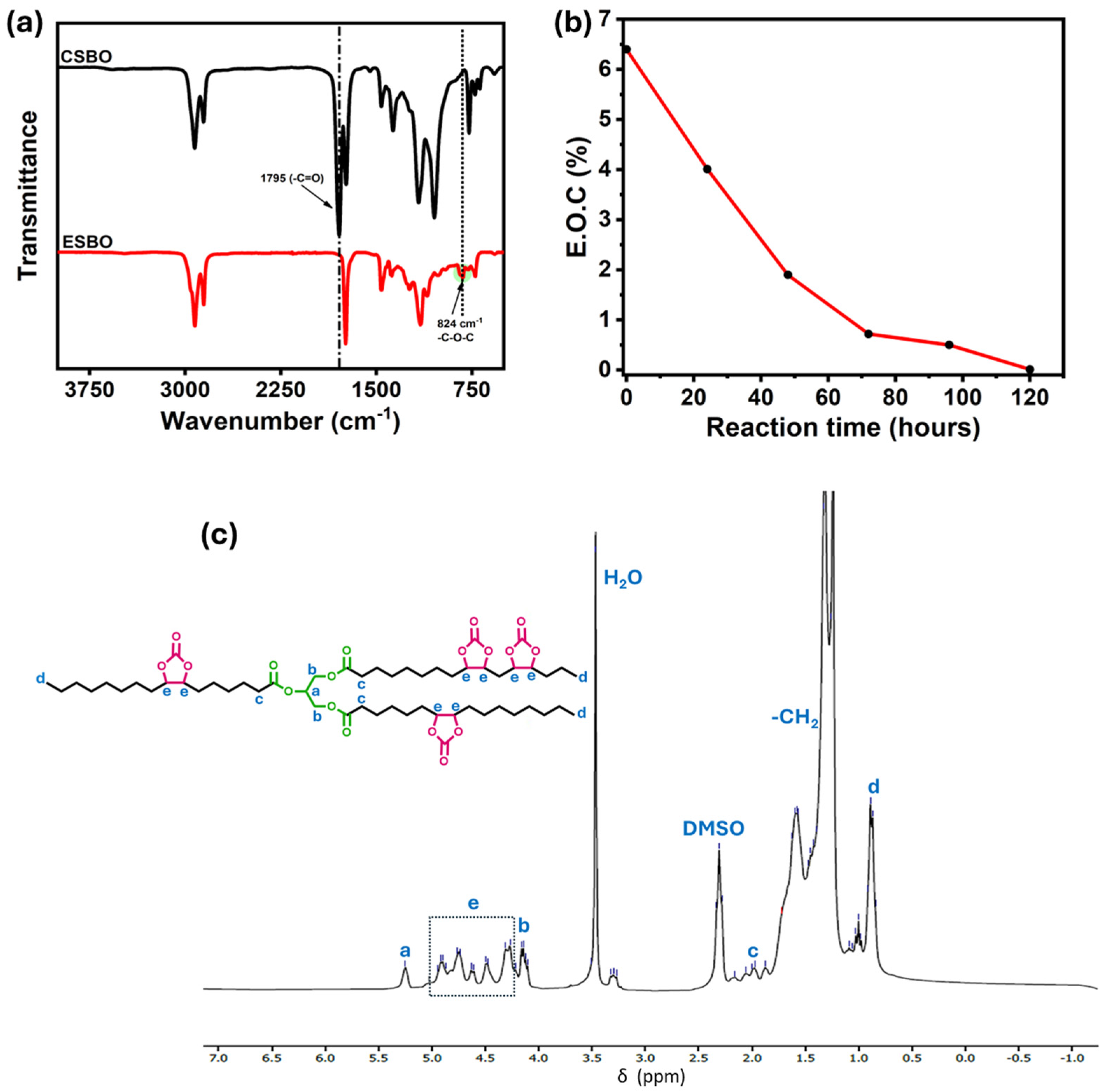 Figure 2. (a) FTIR of ESBO and CSBO. (b) Epoxy conversion over time. (c) 1H NMR spectra of CSBO.