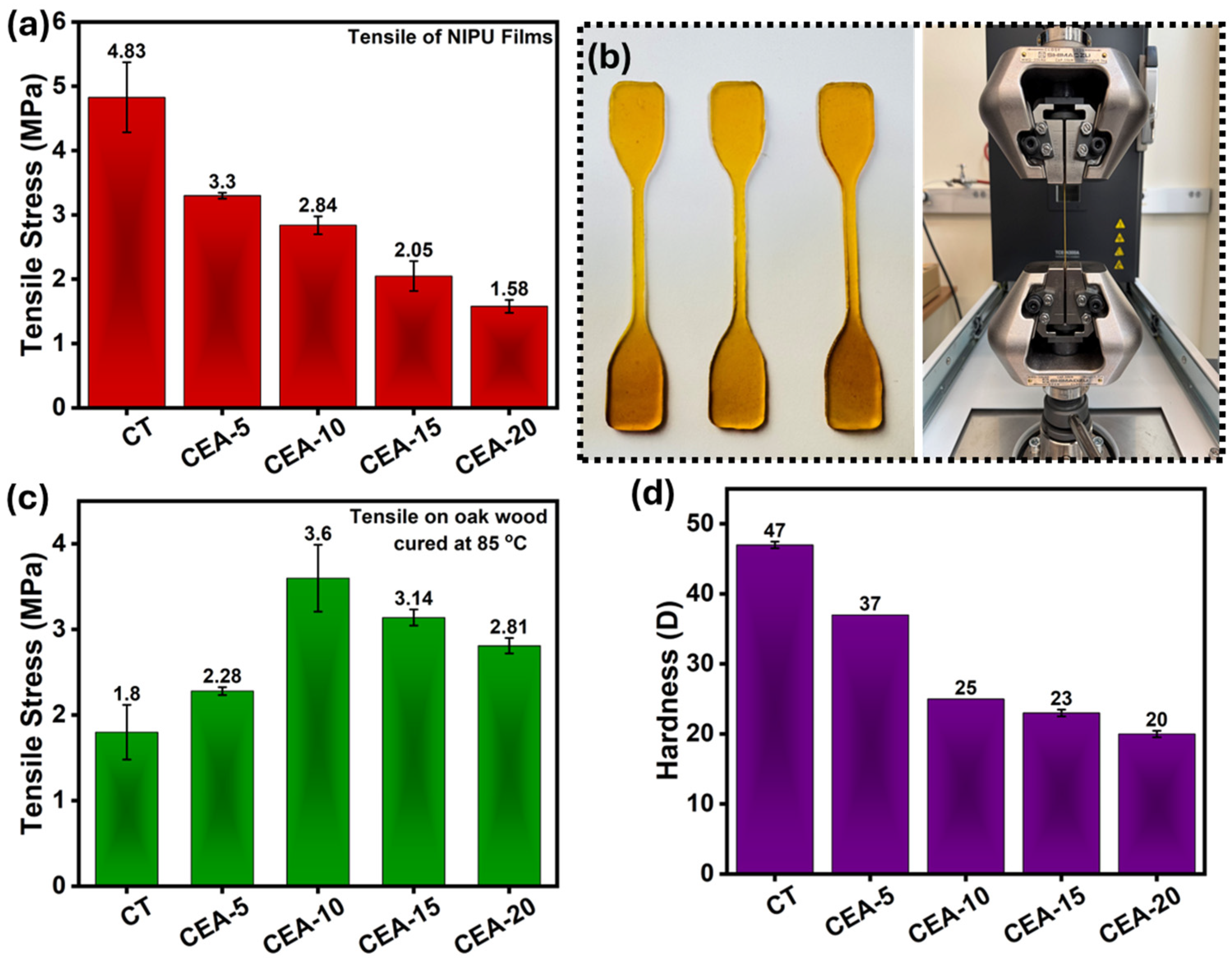 Figure 4. (a) Tensile strength of dog-boned-shaped NIPU material. (b) Pictorial representation of tensile strength test performance. (c) Tensile strength of oak wood adhesive samples. (d) Hardness of NIPU materials.