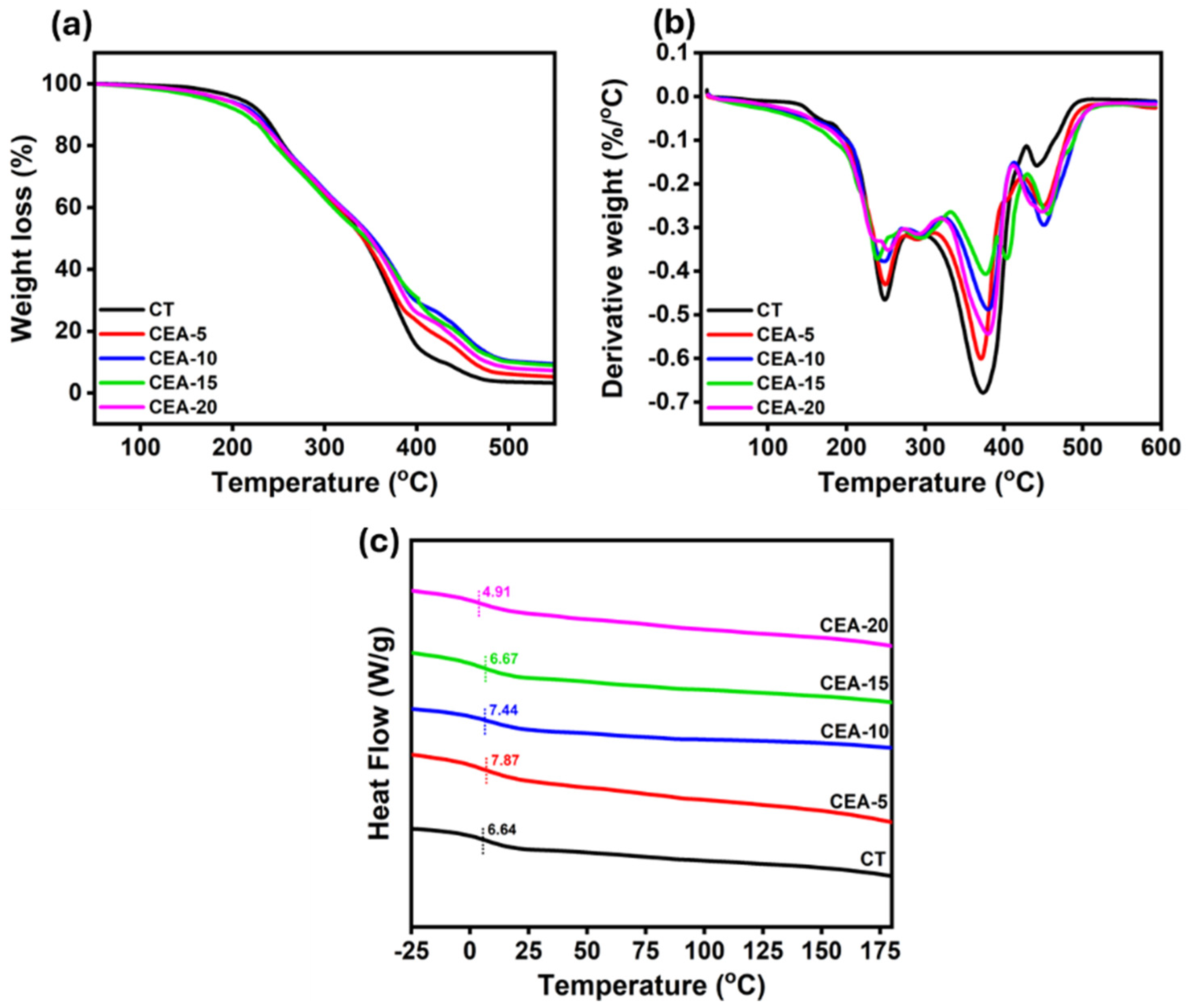 The TGA and derivative thermogram (DTG) curves of the CSBO-based NIPU coatings (Figure 5a,b) reveal the influence of APTES incorporation on the thermal stability of the system. All formulations CT and APTES-modified hybrids NIPU materials 5, 10, 15, and 20 wt% (CEA-5, CEA-10, CEA-15, CEA-20) exhibited a principal degradation stage between 250 and 350 °C, attributed to the breakage of urethane linkage, leaving less than 10% residue at 450–500 °C, attributed to the decomposition of char residues. Another degradation between 350 and 450 °C could be due to the soft aliphatic segments of the polymer backbone, such as carbon chain length from CSBO [24,57,58]. The CT film showed the earliest mass-loss onset and the most intense DTG peak near 350–450 °C. Incorporation of 5 wt% APTES (CEA-5) slightly delayed the onset of degradation and broadened the DTG peak, indicating improved thermal stability. The flexible Si–O–Si linkages formed by APTES hydrolysis and condensation acted as thermally stable domains that dissipated localized stress and delayed chain scission. At intermediate APTES loadings (10–15 wt%), the TGA/DTG profiles displayed further delayed T5% values and broader decomposition ranges, confirming the formation of an organic–inorganic network. The siloxane domains absorbed heat and restricted segmental motion, while β-hydroxyurethane segments maintained structural cohesion. Such behavior agrees with prior reports showing that hybrid siloxane linkages enhance degradation onset while reducing modulus through flexible segment incorporation [59]. At the highest APTES concentration (CEA-20), thermal improvement became marginal: the degradation onset was similar to that of the control, though the residual mass was slightly higher. This behavior suggests that excess siloxane condensation and phase separation hinder uniform heat transfer, forming domains prone to localized decomposition. The mechanical softness (tensile strength 1.58 MPa, hardness 20 D) and moderate elongation (~90%) further support this structural heterogeneity. These findings agree with previous studies [60,61], which reported that hydrogen bonding in β-hydroxyurethane linkages stabilizes NIPUs up to ~300 °C despite the weakening effect of adjacent hydroxyl groups on bond dissociation energy. In the present system, incorporation of siloxane domains enhances heat-transfer resistance.