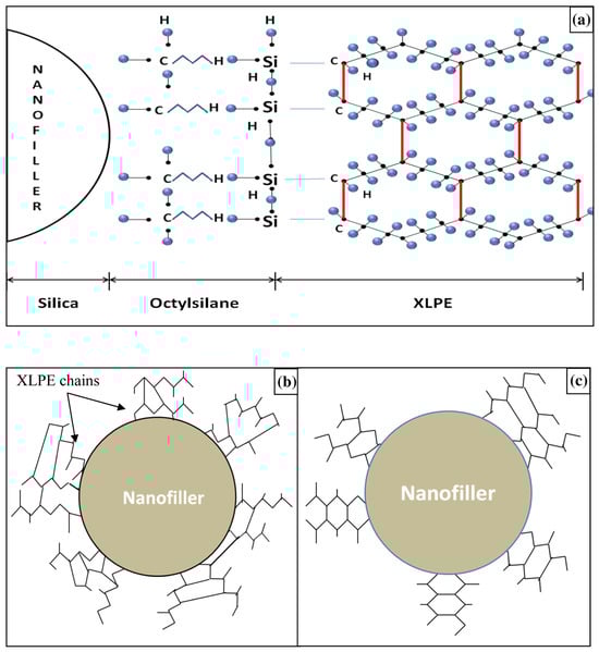 (a) Coupling of octylsilane-functionalized SiO2 into XLPE matrix; representation of polymer chain alignment with (b) non-functionalized and (c) octylsilane-functionalized SiO2 [72].