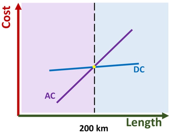 Overall cost of high-voltage AC and DC power transmission systems as a function of transmission distance.
