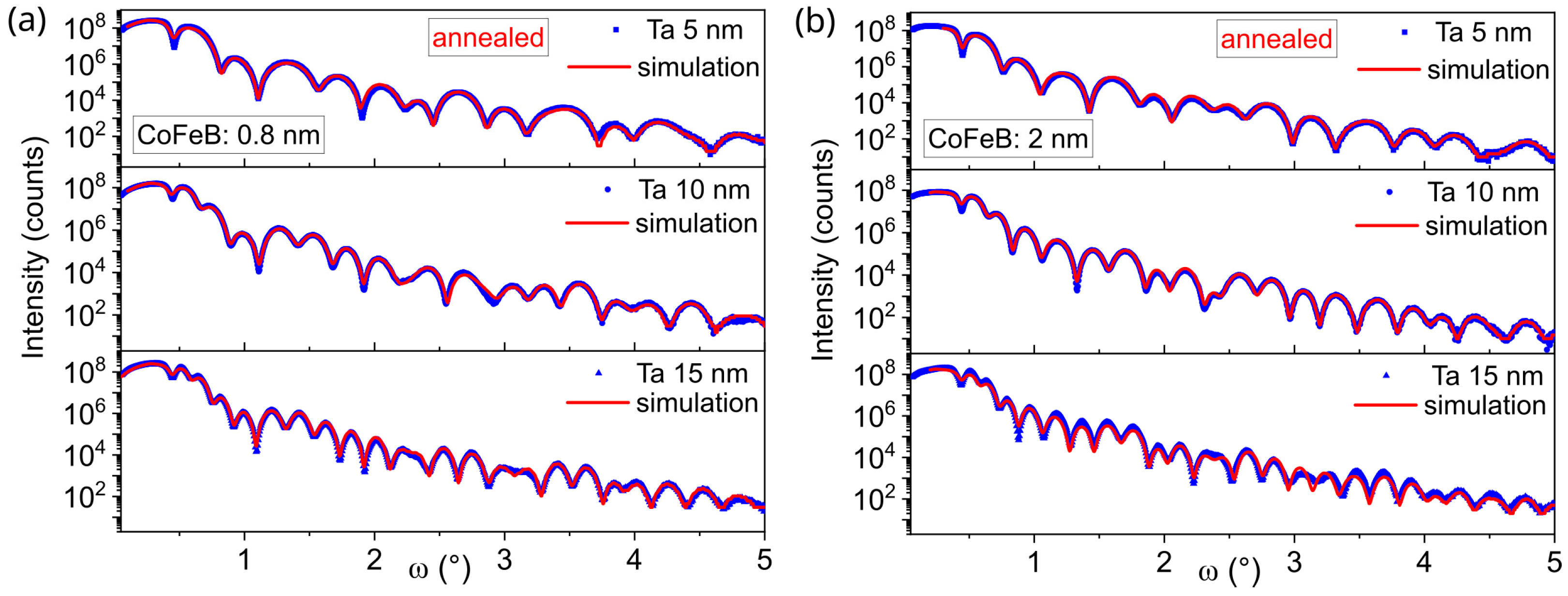 - Jang, S.Y.; You, C.Y.; Lim, S.H.; Lee, S.R. Annealing effects on the magnetic dead layer and saturation magnetization in unit structures relevant to a synthetic ferrimagnetic free structure. J. Appl. Phys. 2011, 109, 013901. [Google Scholar] [CrossRef]