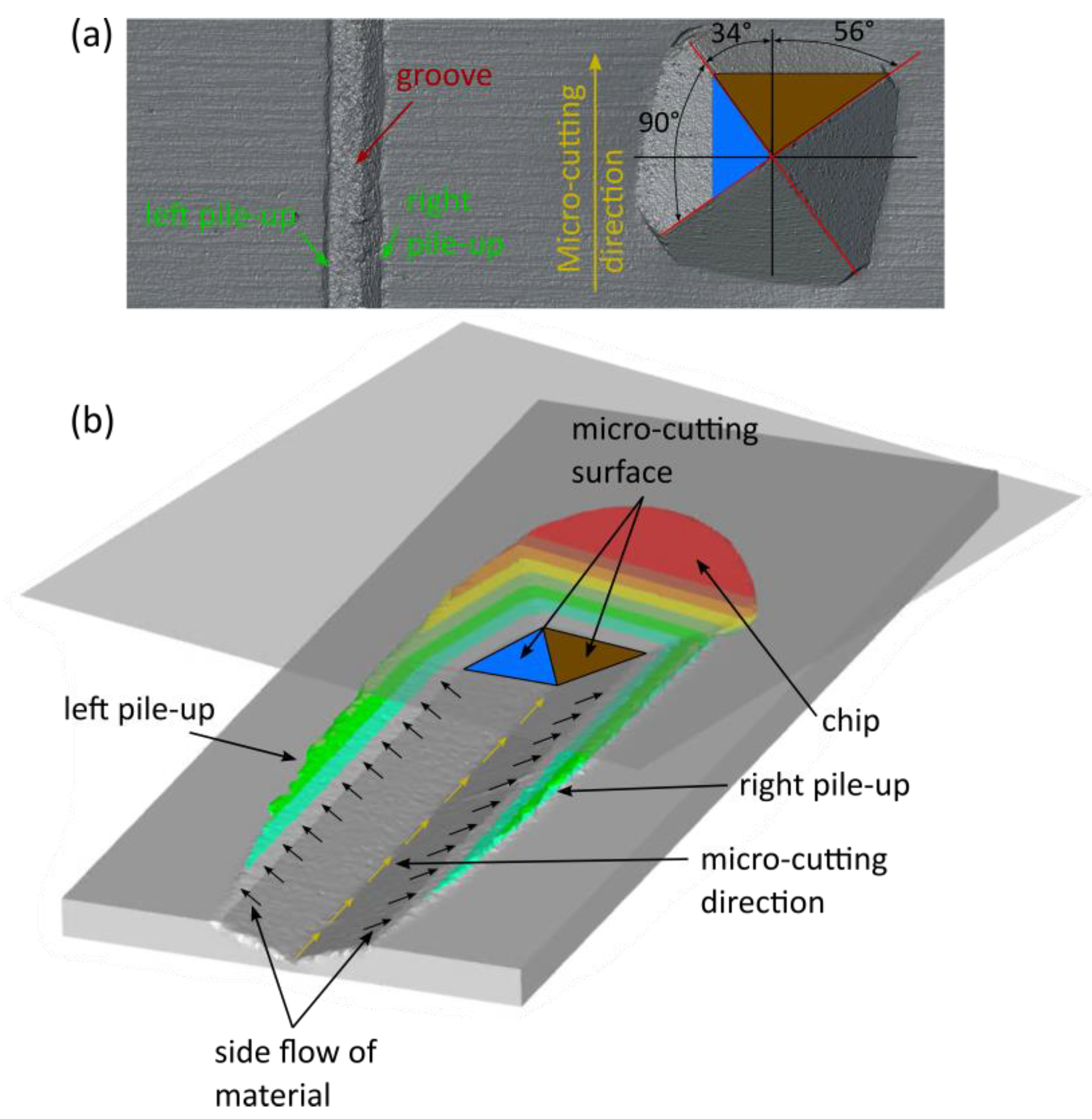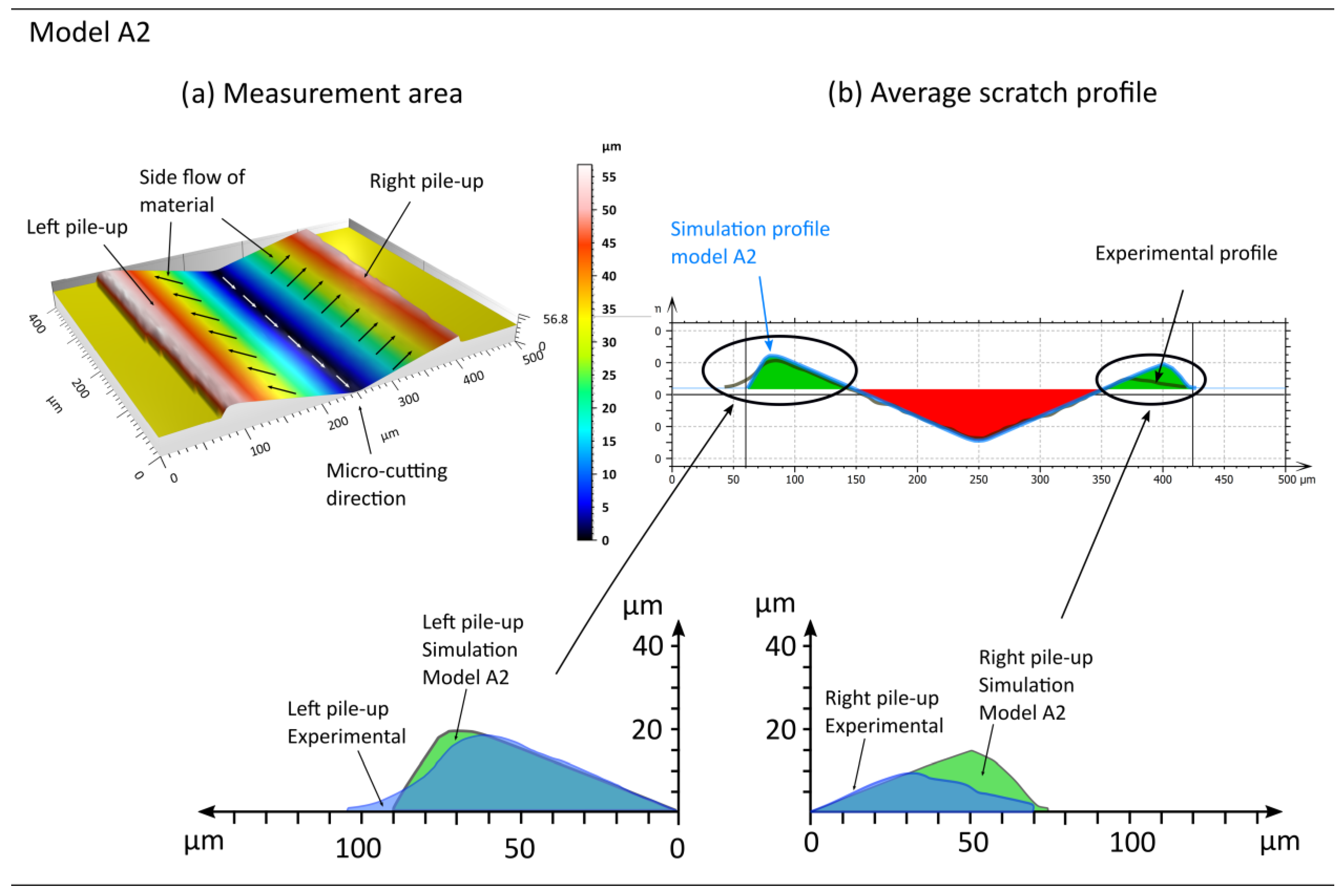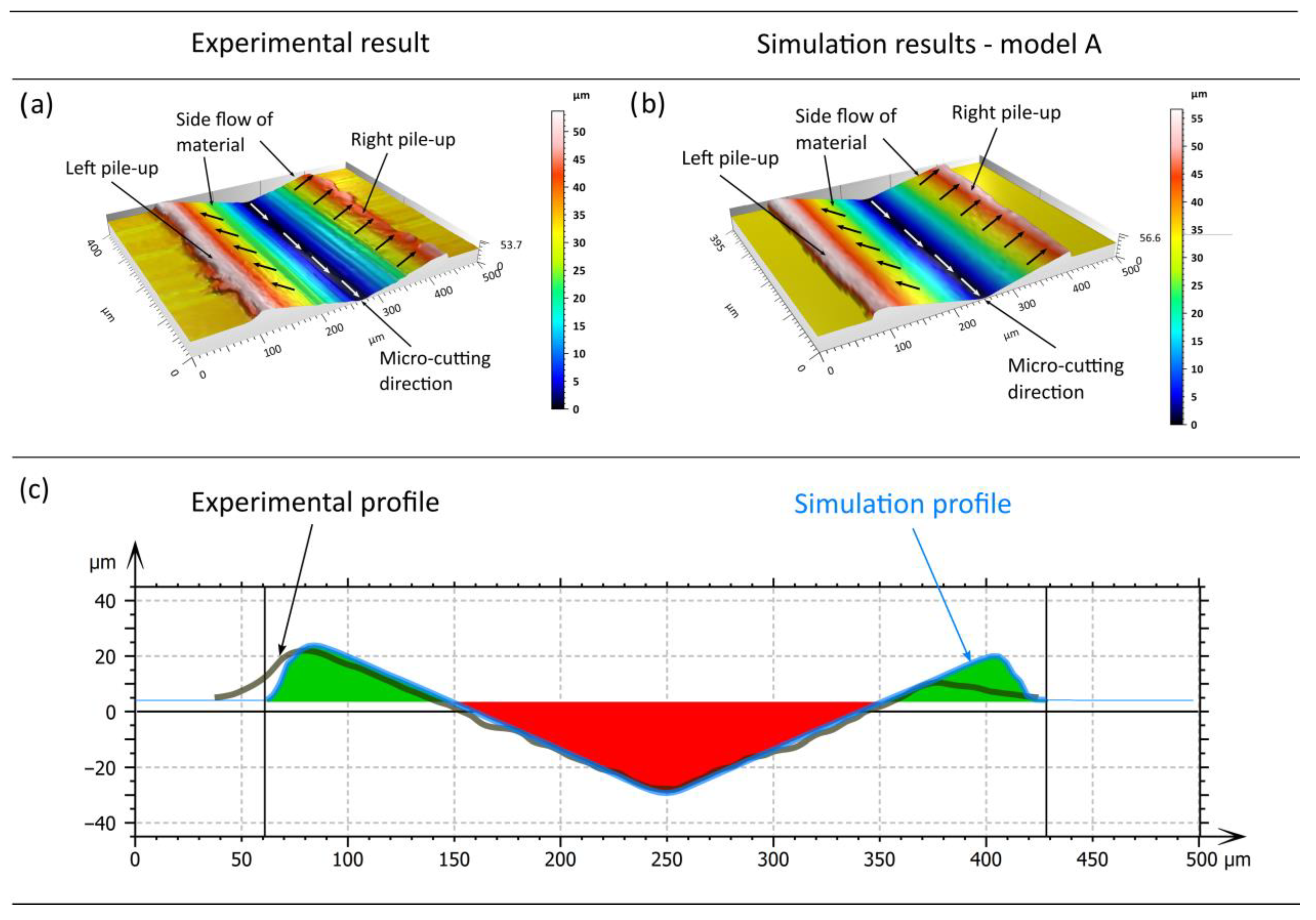 - An analysis of the simulation studies revealed that, while the pile-up cross-sectional area results exhibited satisfactory convergence, their actual shapes significantly deviated from reality. Comprehensive information regarding lateral material displacements during the micro-cutting process can be obtained by analysing the shapes of pile-ups, which were described in the studies as height h, width l, and width to the highest point d. Based on this information, the influence of tuning the Johnson–Cook constitutive model parameters on the convergence of computer simulation models with experimental studies can be estimated.