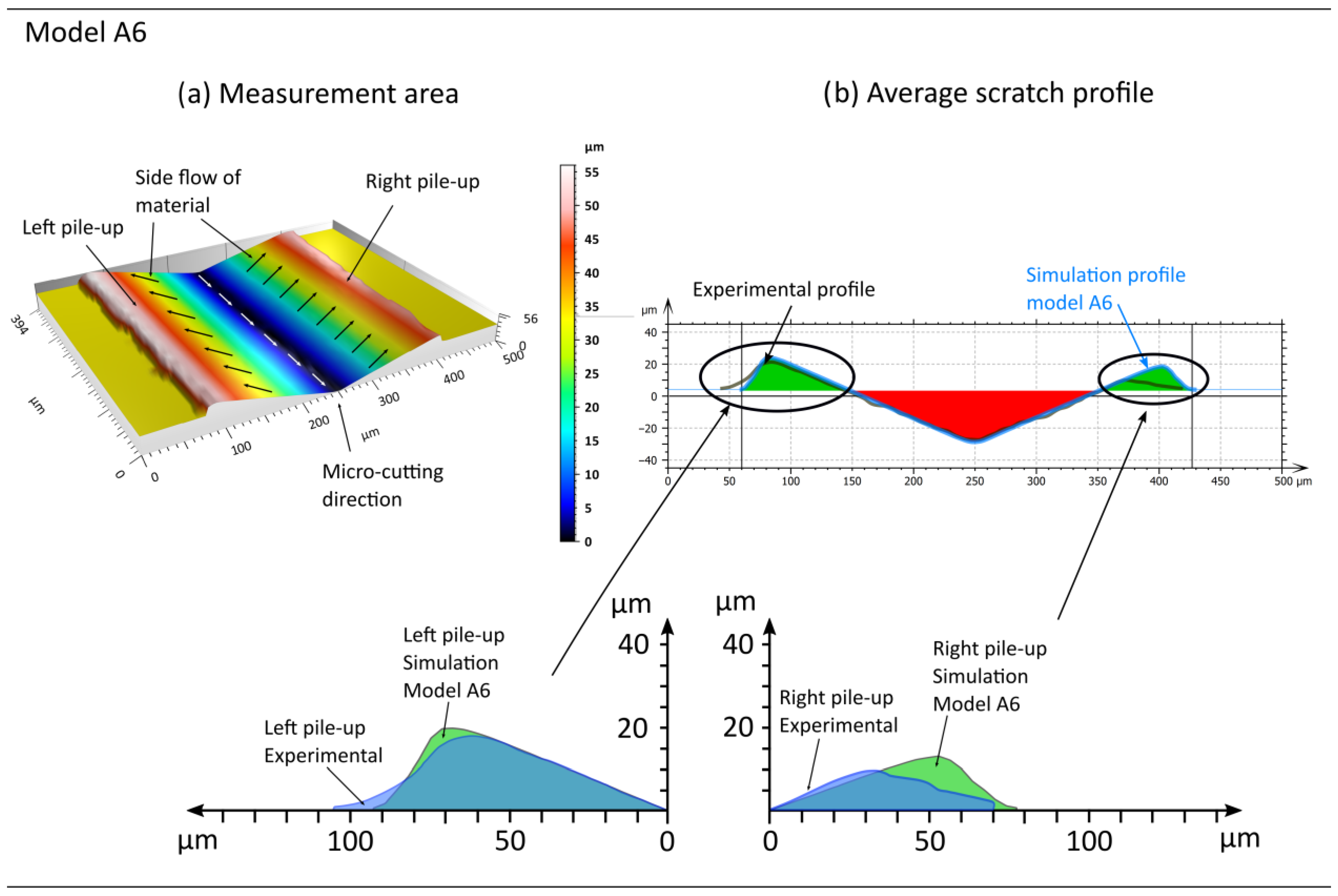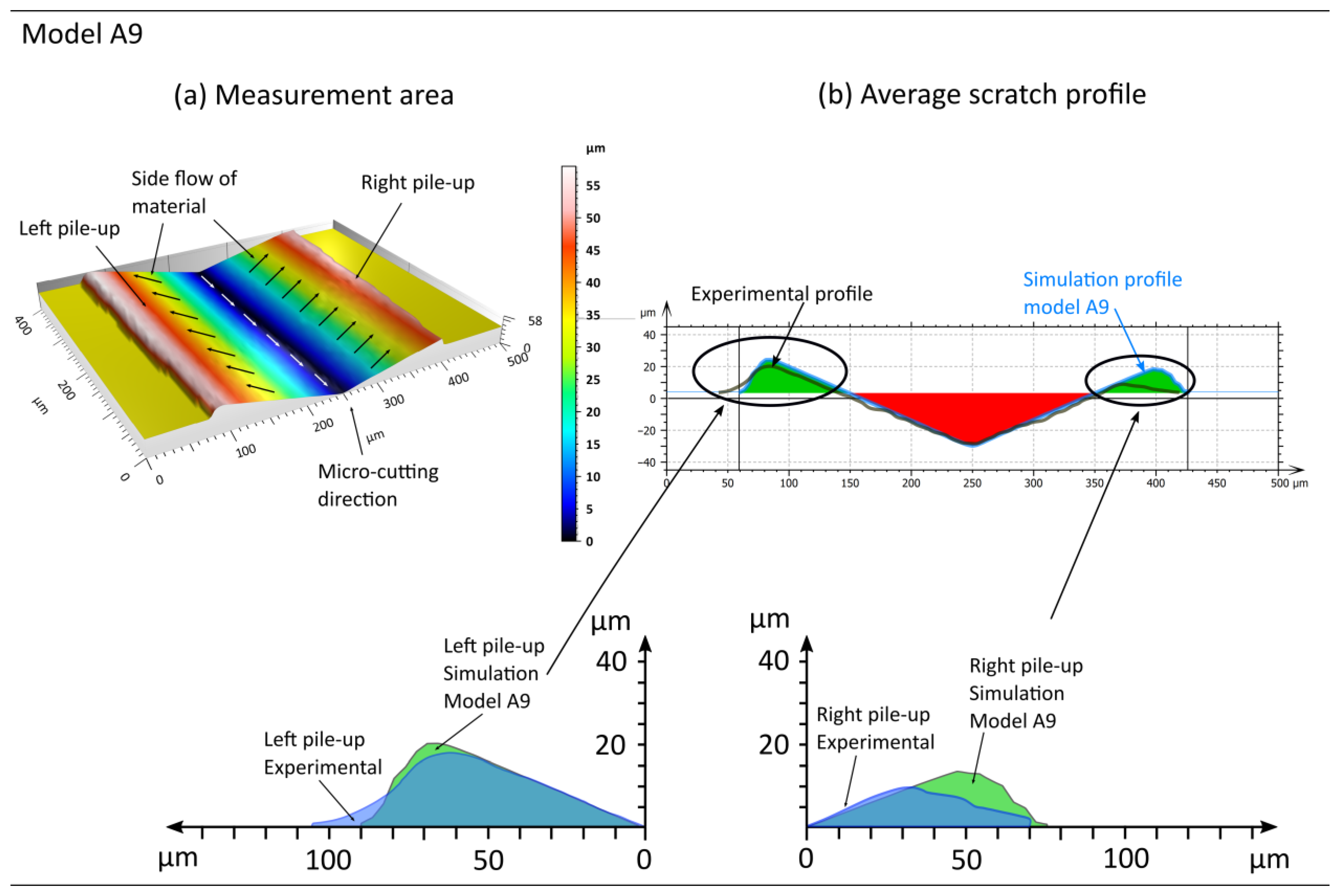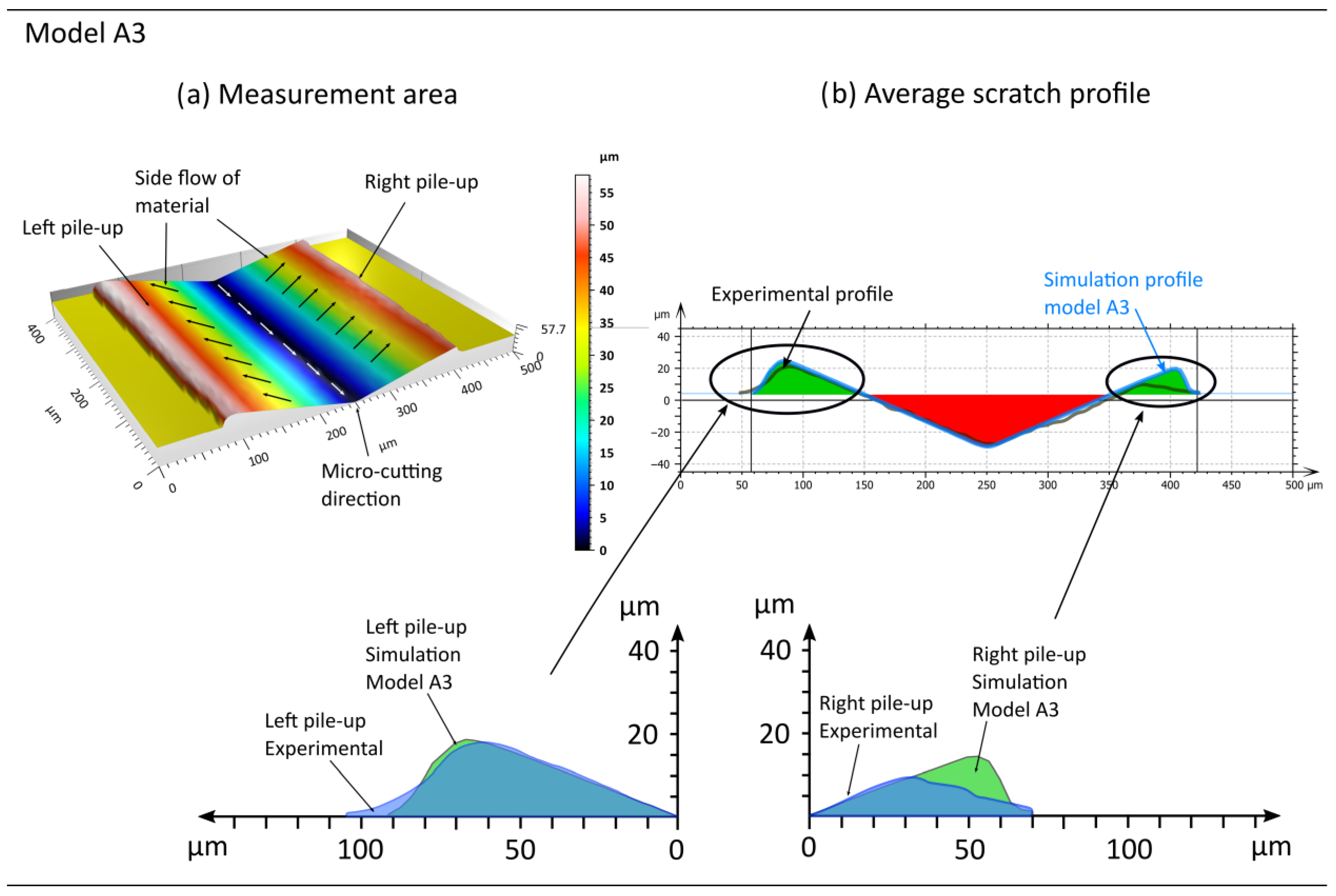 - The scratch test, conducted experimentally and computationally with velocities typical for grinding processes, employs a criterion to evaluate the non-conformity of the areas and shapes of lateral pile-ups and scratches. This test facilitates the tuning of the Johnson–Cook constitutive model parameters. An analysis of the criterion revealed that the optimal convergence of the simulation study results with experimental data was achieved for model A3. In this model, the results of the summation of the non-conformity criteria for both the pile-up and groove cross-sectional areas , as well as the summation of deviations in parameters defining the shape of lateral pile-ups and scratches , were the most effective. The proposed methodology reduced the mismatch criterion () from 0.88 (baseline model A) to 0.46 (optimised model A3), representing a 47% improvement in volumetric accuracy.