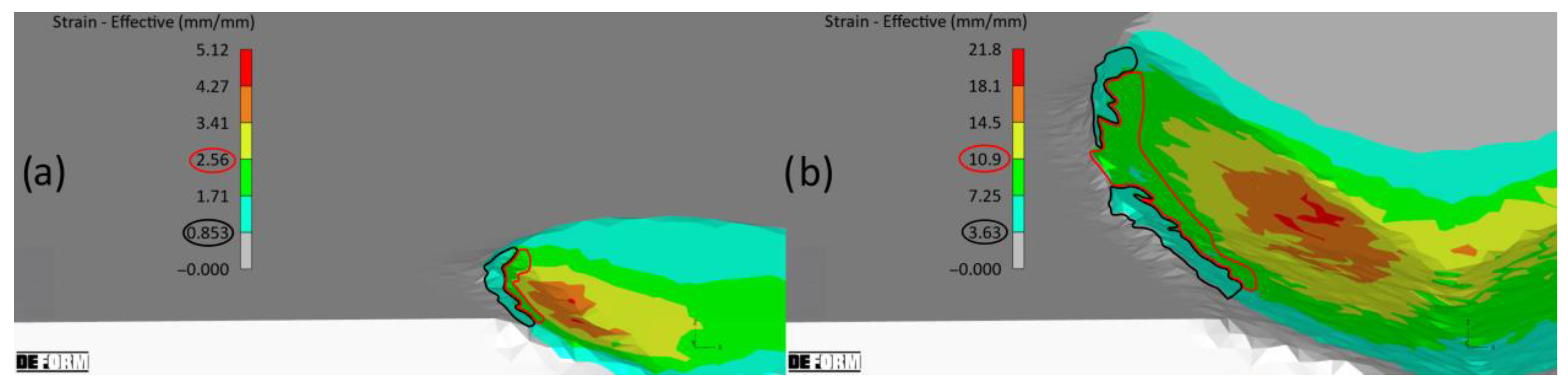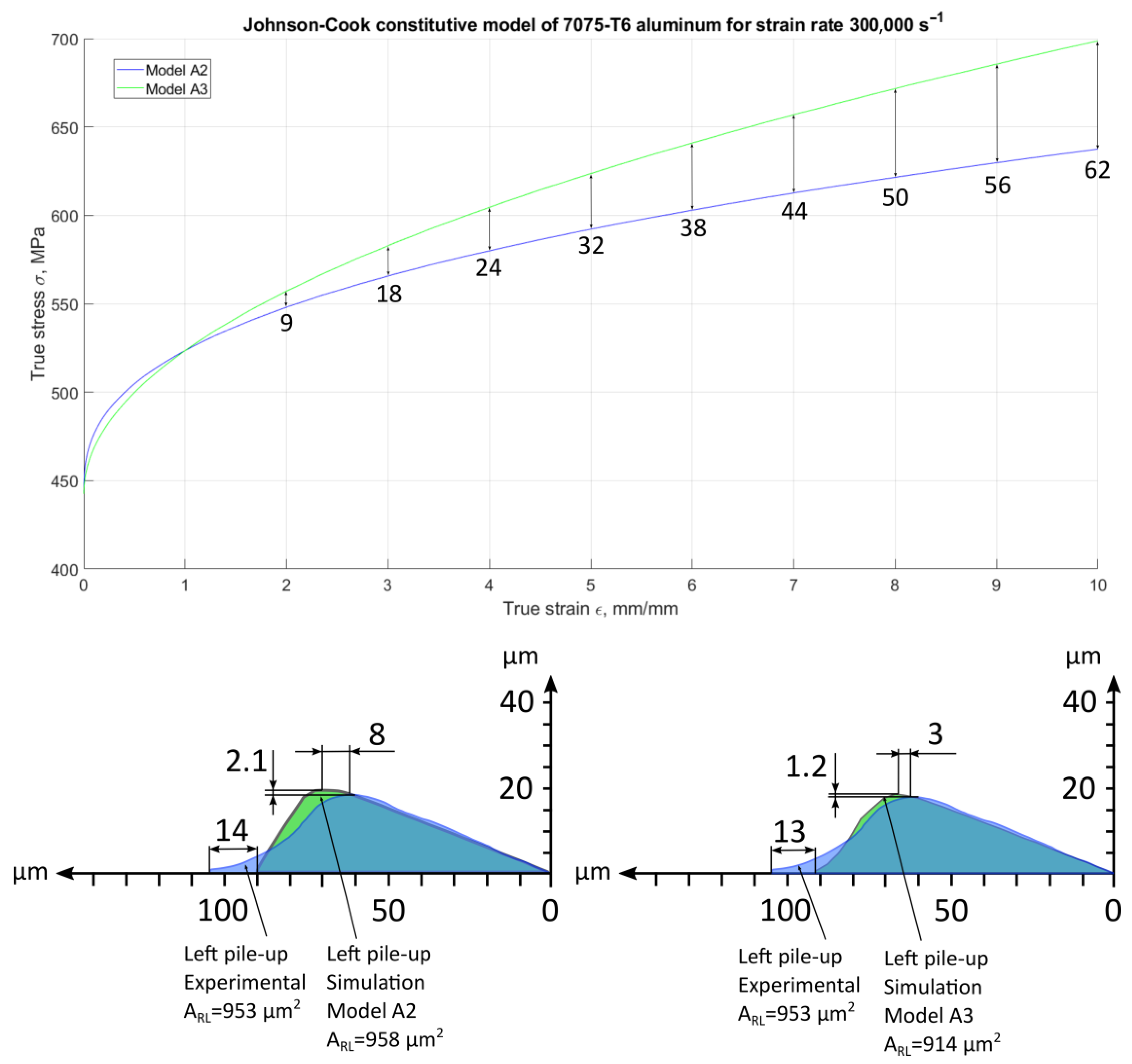 - The optimal convergence of pile-up cross-sectional area ARL and ARR, as well as the shape lRL, lRR, dRL, dRR, was achieved by modifying the Johnson–Cook model parameters B and n, which govern the material’s plastic strengthening curve, and parameter C, which accounts for the strain rate effects. The most favourable results were obtained for model A3, whose model parameters describing aluminium alloy 7075-T6 were as follows: A = 473 MPa, B = 80 MPa, n = 0.5, C = 0.001.