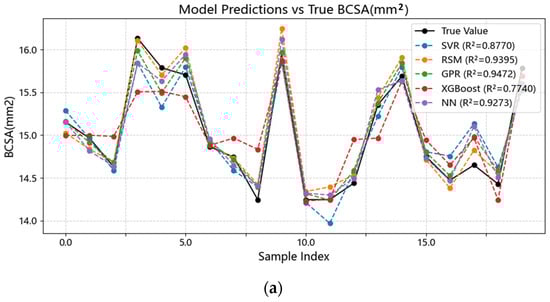 Five models—SVR, GPR, NN, Response Surface Methodology (RSM), and XGBoost—were comprehensively compared in terms of predicting bead width (W), bead height (H), and cross-sectional area (BCSA). Model performance was evaluated using R2, MAE, MAPE, and RMSE (Table 1), with R2 as the primary selection criterion. Figure 2, Figure 3 and Figure 4 illustrate the results. GPR achieved the best performance across W, H, and BCSA, particularly for W prediction, achieving R2 = 0.955 and MAE = 0.145 mm on the validation set, indicating strong capability in capturing nonlinear relationships. Linear models such as RSM could fit general trends but failed to accurately capture the negative correlation between laser power and H, leading to R2 values 1.1–3.8% lower than GPR. XGBoost exhibited severe overfitting under small-sample conditions, with validation R2 below 0.6, making it unsuitable for the current dataset.