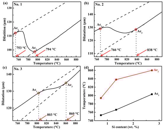 Experimental dilatation curves during heating of the three steels: (a) No. 1, (b) No. 2, and (c) No. 3, and (d) Ac1 and Ac3 as a function of Si content.