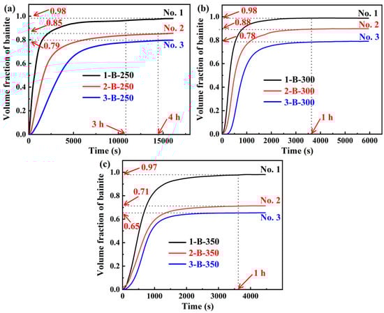 For the austempering process, the isothermal holding temperatures were selected between Ms and Bs (bainite start temperature), where bainite transformation occurs without martensite formation. In addition, to ensure a good combination of hardness, strength, ductility, and toughness, and with reference to the relevant studies [49,50,51], the isothermal temperatures were set as 250 °C, 300 °C, and 350 °C. The isothermal time was chosen according to the results of dilatometry experiments. The specimens of the three steels were heated to 900 °C for 90 min, followed by quenching to 250 °C, 300 °C, and 350 °C, and isothermally held for a specific duration, and then quenched to RT. The cooling rate was 50 °C/s. The volume fraction of bainite as a function of holding time was determined by applying the lever rule on the dilation data [52] and the bainite fraction at the endpoint obtained by XRD. Figure 3 shows the volume fraction of bainite as a function of holding time at different isothermal temperatures. It can be seen that when the isothermal temperature is 250 °C, the No. 1 steel requires 3 h to substantially complete the bainitic transformation, whereas the No. 2 and No. 3 steels require a longer duration of 4 h. When the isothermal temperatures are 300 °C and 350 °C, one hour is sufficient for the three steels to substantially complete the transformation. Thus, the isothermal temperatures and the corresponding times for the austempering processes of the three steels were determined. They are referred to as ‘1/2/3 B-250’, ‘1/2/3 B-300’ and ‘1/2/3 B-350’. Furthermore, in Figure 3, the final bainite content decreases with the increase in Si content for each isothermal temperature, and for the No. 2 and No. 3 steels, the final bainite content shows a decreasing trend with the increase in isothermal temperature. The addition of Si can inhibit the precipitation of carbides and promote the enrichment of C in the austenite, which can improve the stability of RA [53]. Moreover, increasing Si content can reduce the bainitic transformation kinetics and cause the incompleteness of bainitic transformation [54].