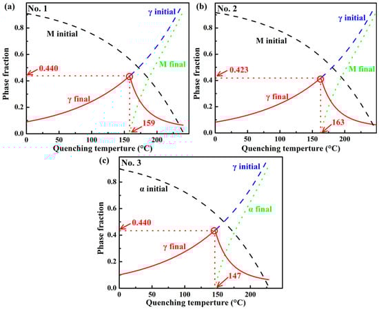 Predicted evolution of microstructural constituents with quenching temperature without consideration of other competing reactions, such as C clustering, C trapping at dislocations, and carbide precipitation, in the investigated three steels: (a) No. 1, (b) No. 2, and (c) No. 3. M is martensite and γ is austenite.