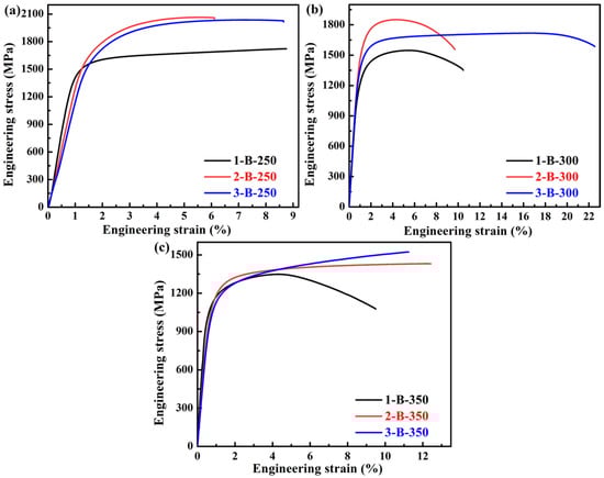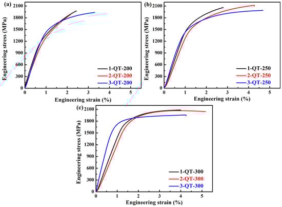 Representative engineering stress–strain curves of the investigated three steels treated by different tempering temperatures for QT processes: (a) 200 °C, (b) 250 °C, and (c) 300 °C.