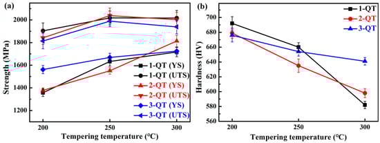 For the QT process, according to the results of the references [2,46,47,48], the tempering temperatures were set as 200 °C, 250 °C, and 300 °C, with the tempering time of 90 min. They are referred to as ‘1/2/3-QT-200’, ‘1/2/3-QT-250’, and ‘1/2/3-QT-300’.