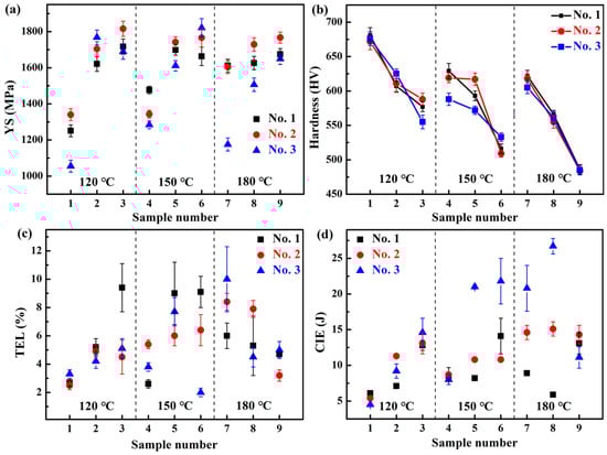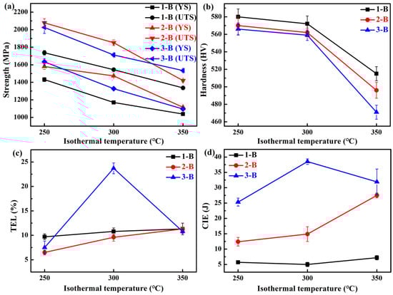 (a) YS and UTS, (b) hardness, (c) TEL, and (d) CIE with different isothermal temperatures of the investigated three steels.