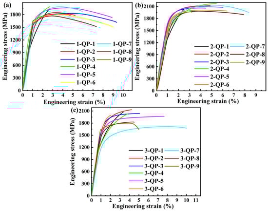 Representative engineering stress–strain curves of the investigated three steels treated by QP processes: (a) No. 1, (b) No. 2, and (c) No. 3.