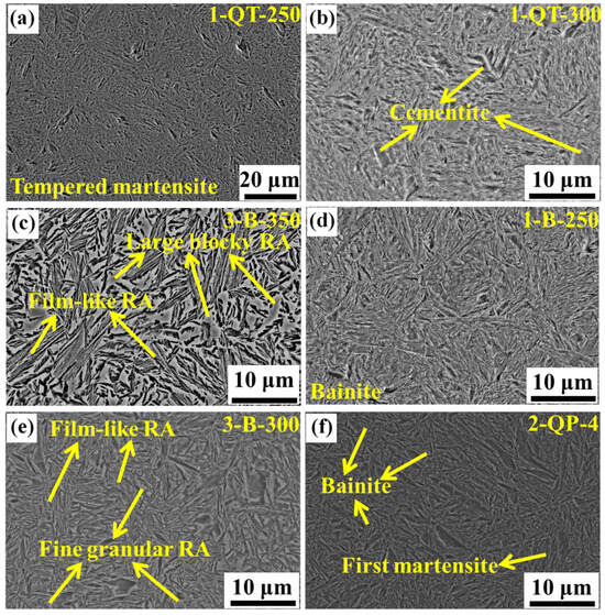 SEM micrographs show the representative microstructure of the three steels subjected by different heat treatments: (a) 1-QT-250, (b) 1-QT-300, (c) 3-B-350, (d) 1-B-250, (e) 3-B-300, and (f) 2-QP-4.