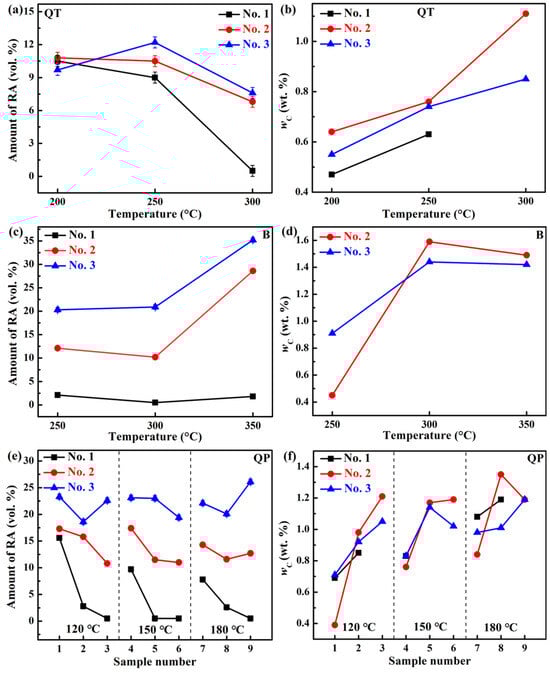 (a,c,e) show the RA content of the investigated three steels by different heat treatments, including QT, austempering, and QP, respectively. (b,d,f) show the wC of the steels by different heat treatments.