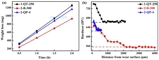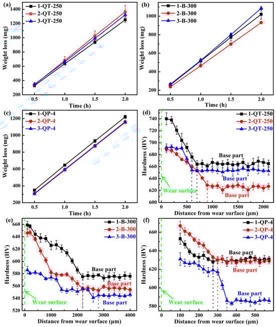 The microhardness curves in the normal direction of the wear surface are shown in Figure 13d–f. It can be seen that the microhardness of all samples decreases with the increase in the distance below the wear surface and eventually approaches the matrix microhardness, indicating the work hardening capacities after the impact deformation. For the QT-250 process, the wear surface hardness of the 1-QT-250 steel increases by 12.1%, which is the highest, and the depth of the affected layer is approximately 700 μm. For the B-300 process, the 1 B-300 and 2 B-300 steels have the maximum increase in the wear surface hardness (~15%), and their depth of the affected layer is ~2200 μm. For the QP-4 process, the 2-QP-4 steel has the maximum increase in the wear surface hardness (~7.8%), and its depth of the affected layer is 300 μm. The 1/2 B-300 steels exhibit the highest work hardening capability, and their plastic deformation can penetrate more deeply into the matrix, thereby strengthening the strain-hardened layer affected by impact wear. During impact wear, the TRIP effect of RA can compensate for the effect of the initially low hardness of the 1/2 B-300 steels on the wear resistance. Furthermore, this effect can be amplified by increasing the impact energy [12]. The fRA of the 1 B-300 steel is lower than that of the 2 B-300, and this may be the reason why the wear resistance of the 2 B-300 steel is better. Figure 14a,b summarizes the plots of mass loss versus wear time for the steels with the best wear performance among the three processes and the hardness distribution profiles after the impact wear tests, respectively. The deep-gradient-layer steel has the optimal impact-abrasive wear resistance [70].