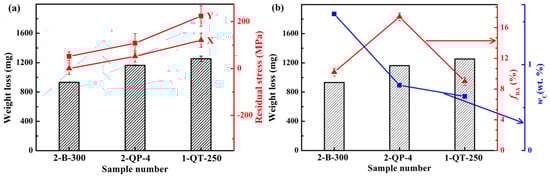 (a) Surface residual stresses in two directions of the 1-QT-250, 2 B-300, and 2-QP-4 steels, as well as the weight losses after impact-abrasive wear tests, and (b) weight losses after impact-abrasive wear tests and the fRA and wC of the 1-QT-250, 2 B-300, and 2-QP-4 steels.