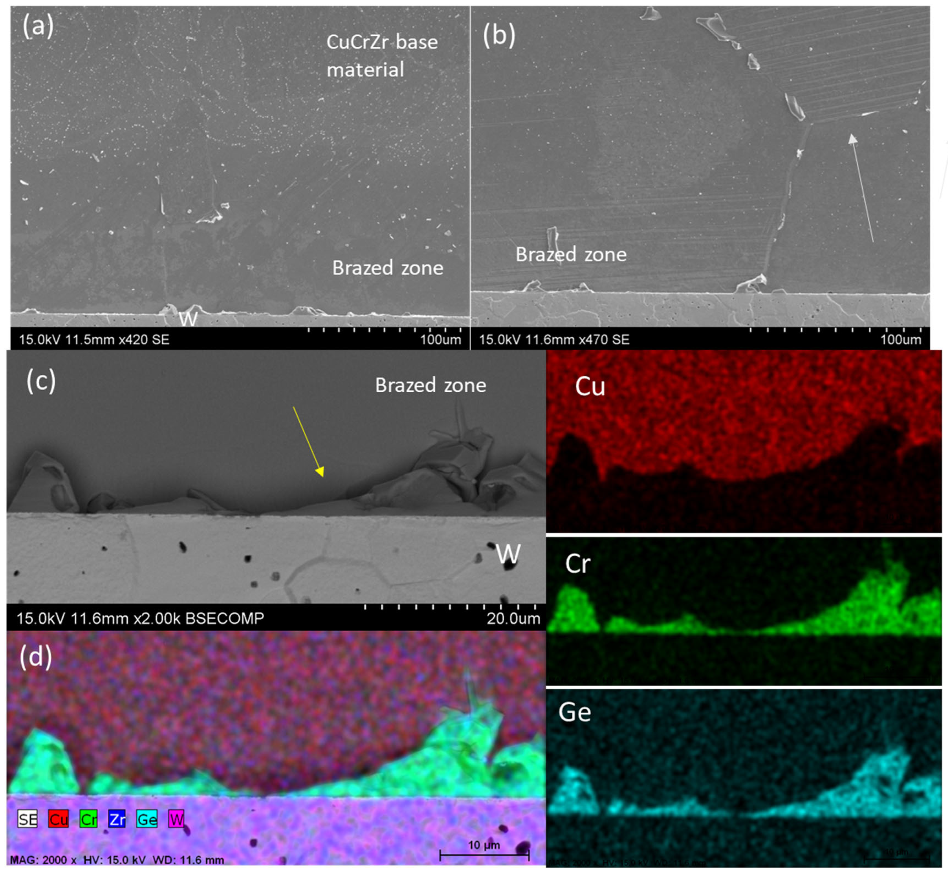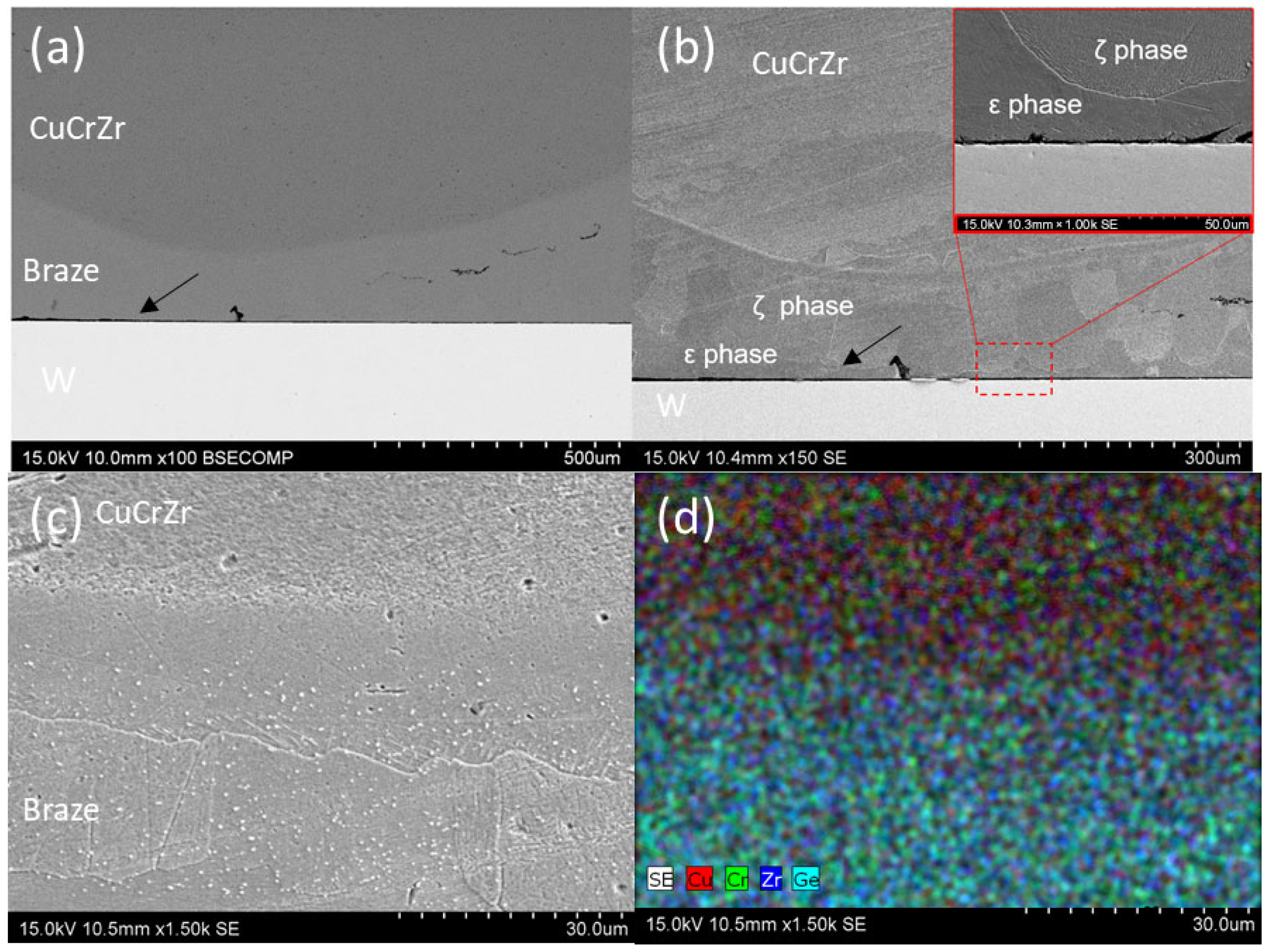 - Cu13Ge and Cu19Ge fillers produced high-quality joints between CuCrZr and tungsten, while Cu33Ge led to brittle and discontinuous interfaces.
