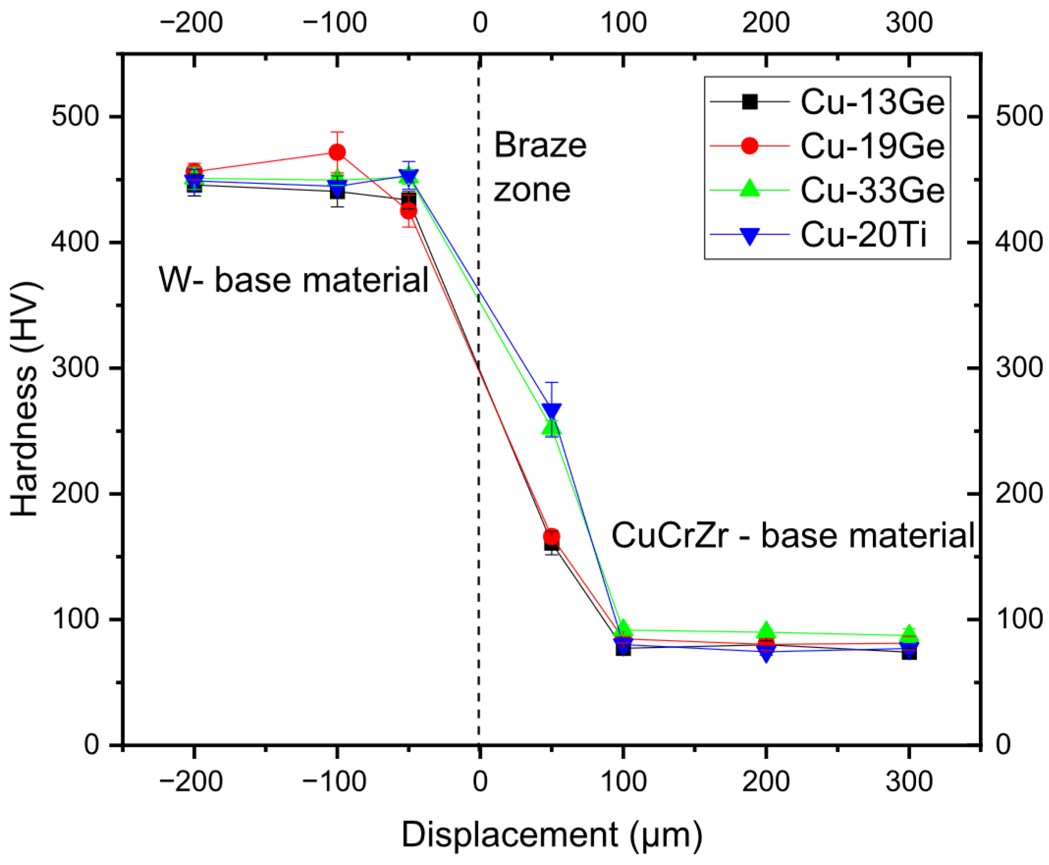 - CuCrZr softened during brazing due to dissolution of strengthening precipitates, but its hardness could be restored through post-brazing heat treatments; the best result was obtained with Cu13Ge after solution annealing and aging, reaching ~116 HV0.1.