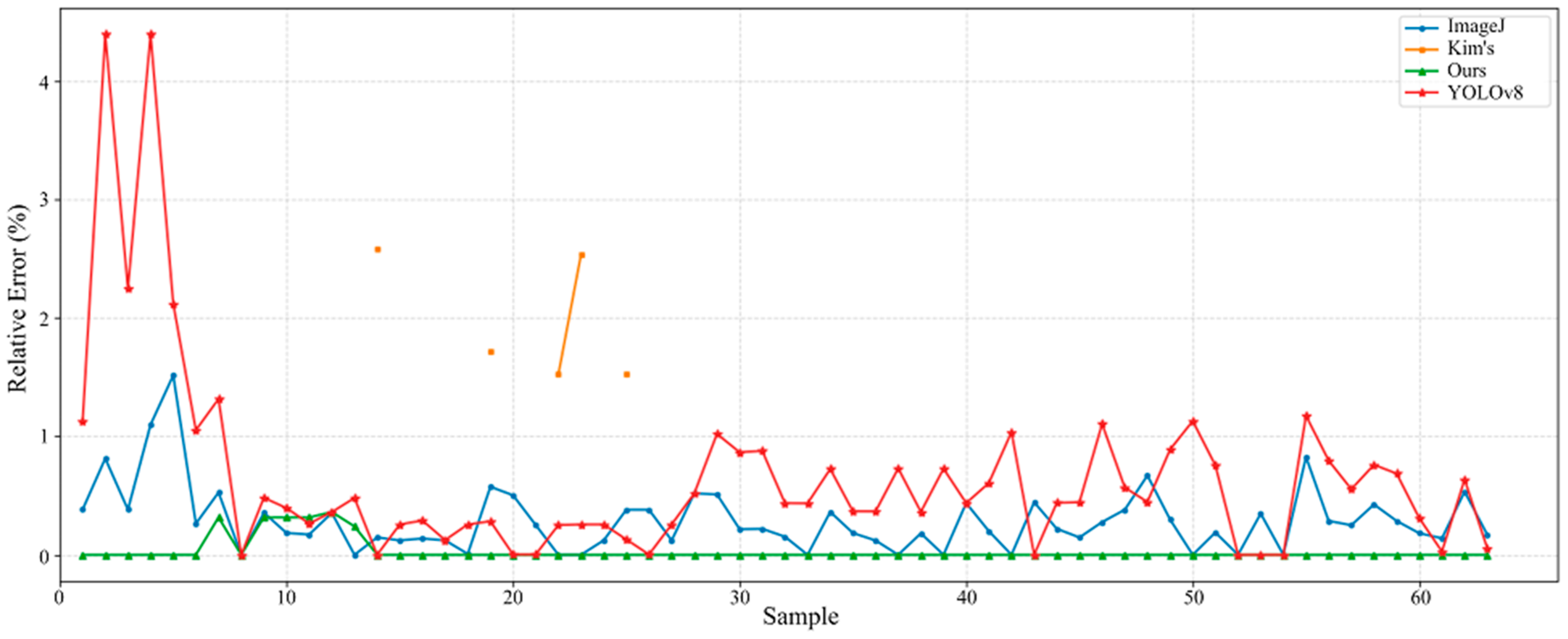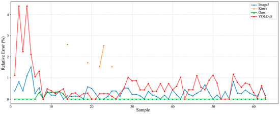 Figure 7. Comparison of the relative error in scale bar pixel length between the manually annotated ground truth and the results obtained using ImageJ, the LIST image analysis platform, YOLOv8, and the proposed automatic scale bar detection method.