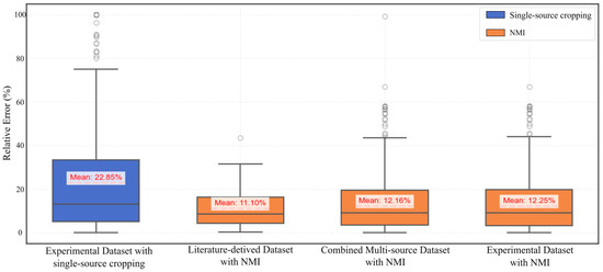 Figure 12. Box plots of the relative error of image porosity based on single-source cropped experimental images and NMI-processed images from the experimental dataset, literature-derived dataset, and the combined multi-source dataset. The comparison highlights the effectiveness of the NMI method in reducing porosity error and improving consistency.