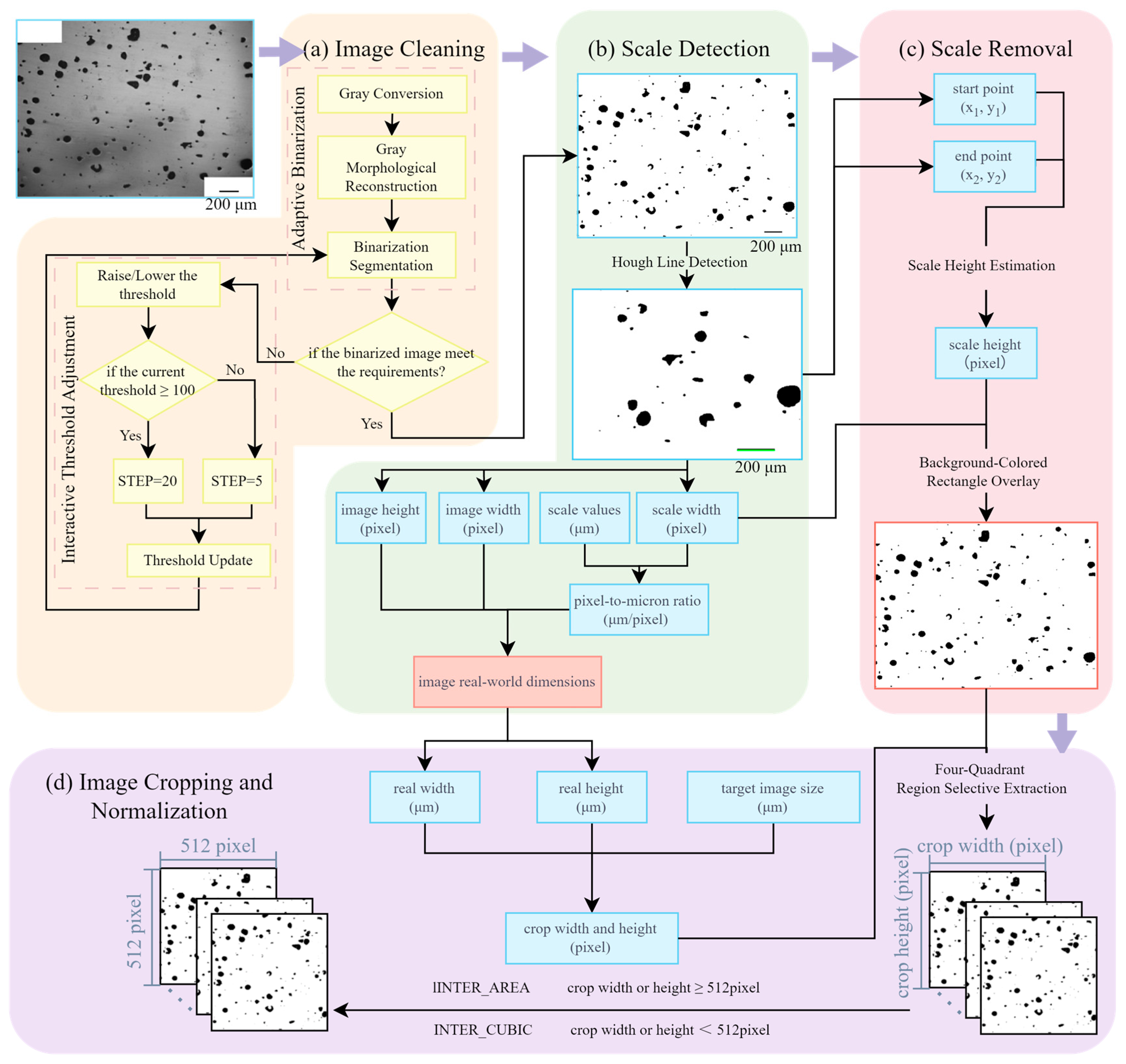 Figure 4. Schematic diagram of the proposed SLM multi-source porosity image integration method: (a) Image cleaning, (b) Scale detection, (c) Scale removal, and (d) Image cropping and normalization.