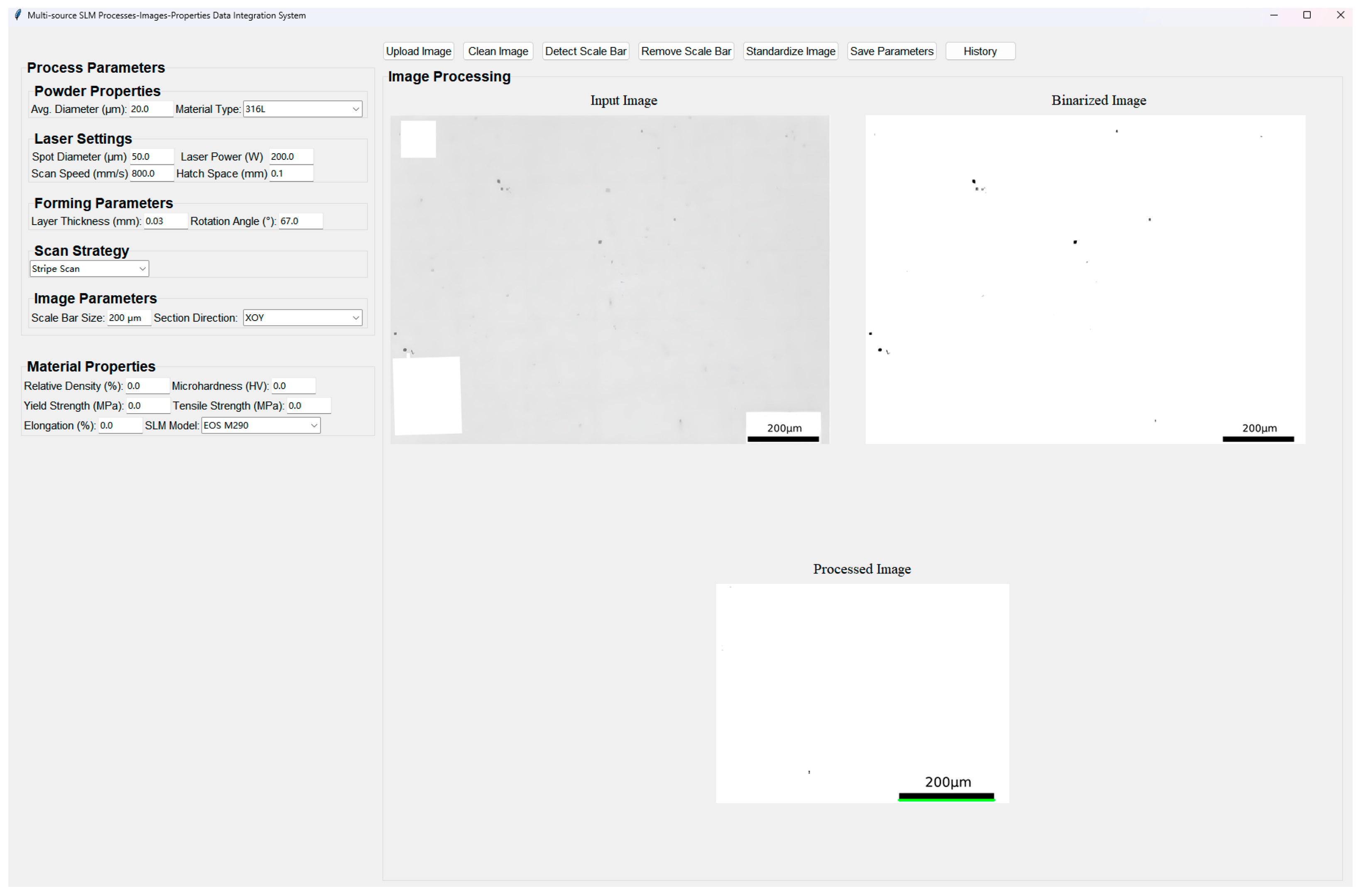 • To establish a comprehensive processes–images–properties dataset collection platform that effectively integrates the normalized porosity images with corresponding SLM process parameters and material performance indicators, providing a solid foundation for subsequent data-driven modeling.