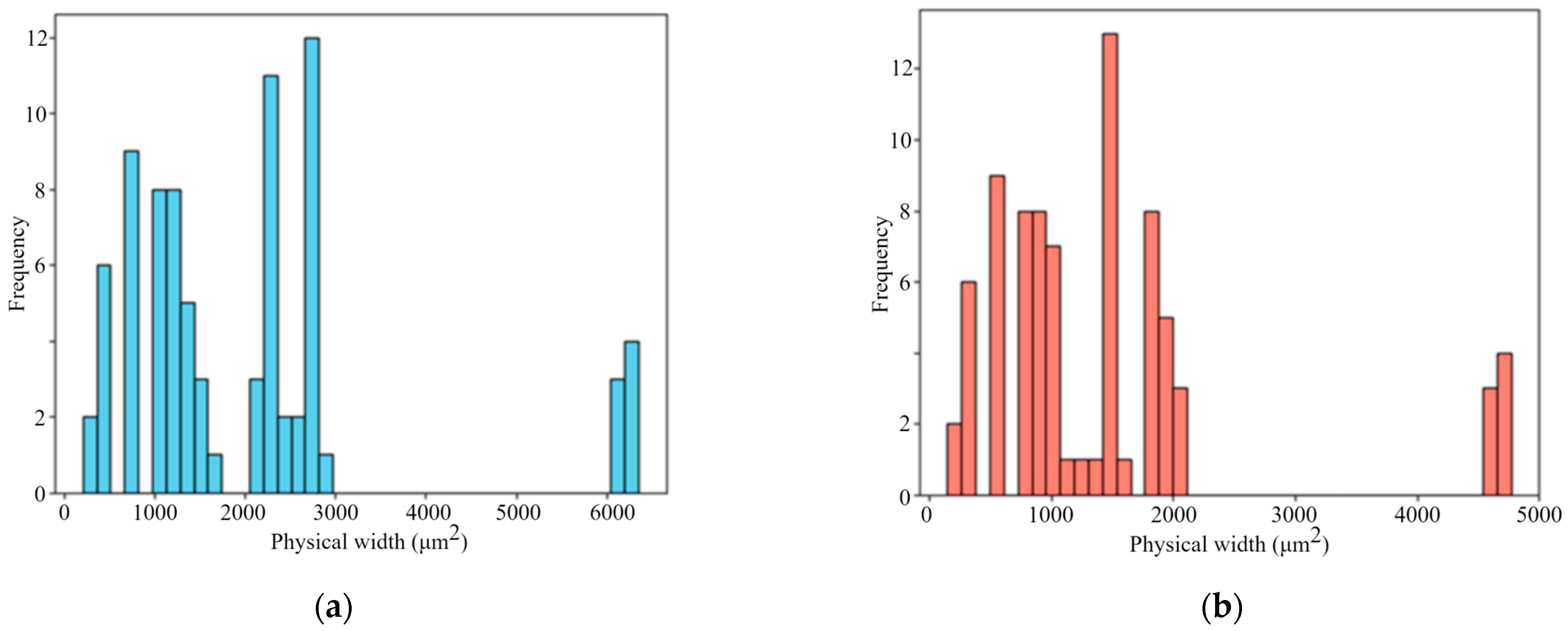Figure 8. Frequency distribution of physical dimensions from Literature-Derived Images: (a) Frequency distribution of physical widths. (b) Frequency distribution of physical heights.