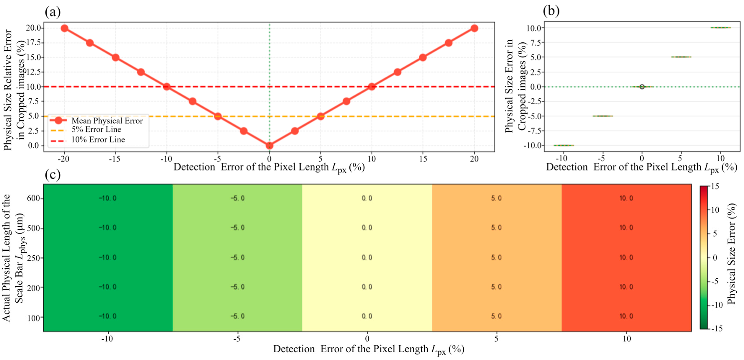 Figure 9. Quantification of Error Propagation and Sensitivity Analysis for Scale Bar Detection Errors of Cropped Images: (a) Error Propagation of Physical Size Relative Error in Cropped Images for Scale Bar Detection Error. (b) Sensitivity of Physical Size Error to Detection Error in Cropped Images. (c) Impact of Actual Physical Length of the Scale Bar and Detection Error of the Pixel Length on Physical Size Error.
