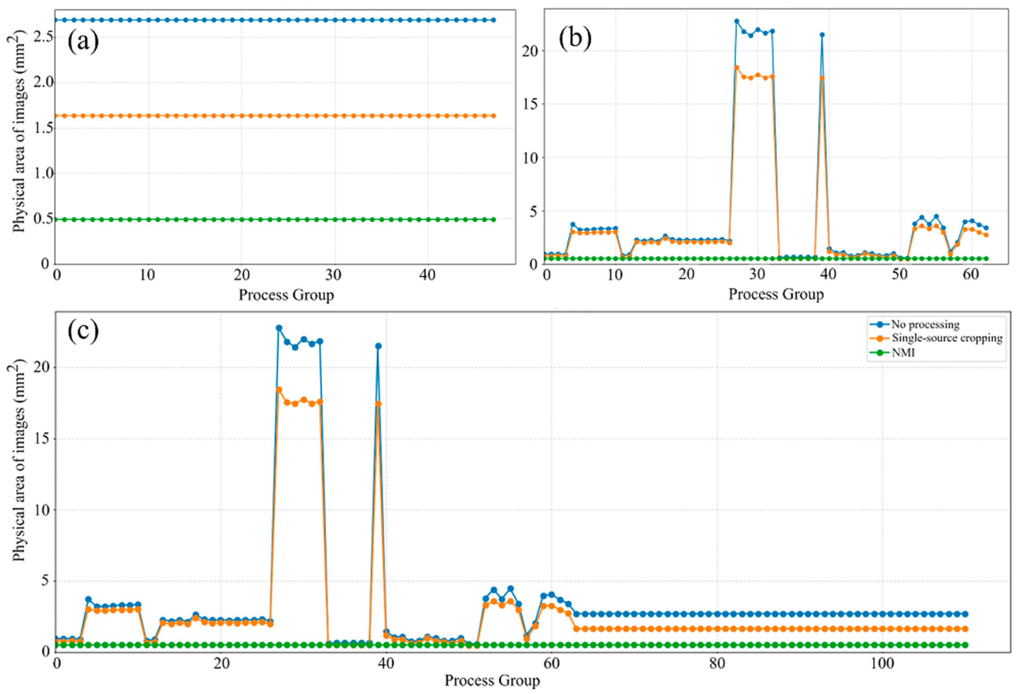 Figure 10. Distribution of image physical areas across three SLM porosity datasets processed using different normalization methods: (a) Experimental dataset. (b) Literature-derived dataset. (c) Combined multi-source dataset. Each subfigure illustrates the physical area of images under three processing conditions: unprocessed original images, single-source cropping, and the proposed NMI method, highlighting the normalization effect across varying data sources.