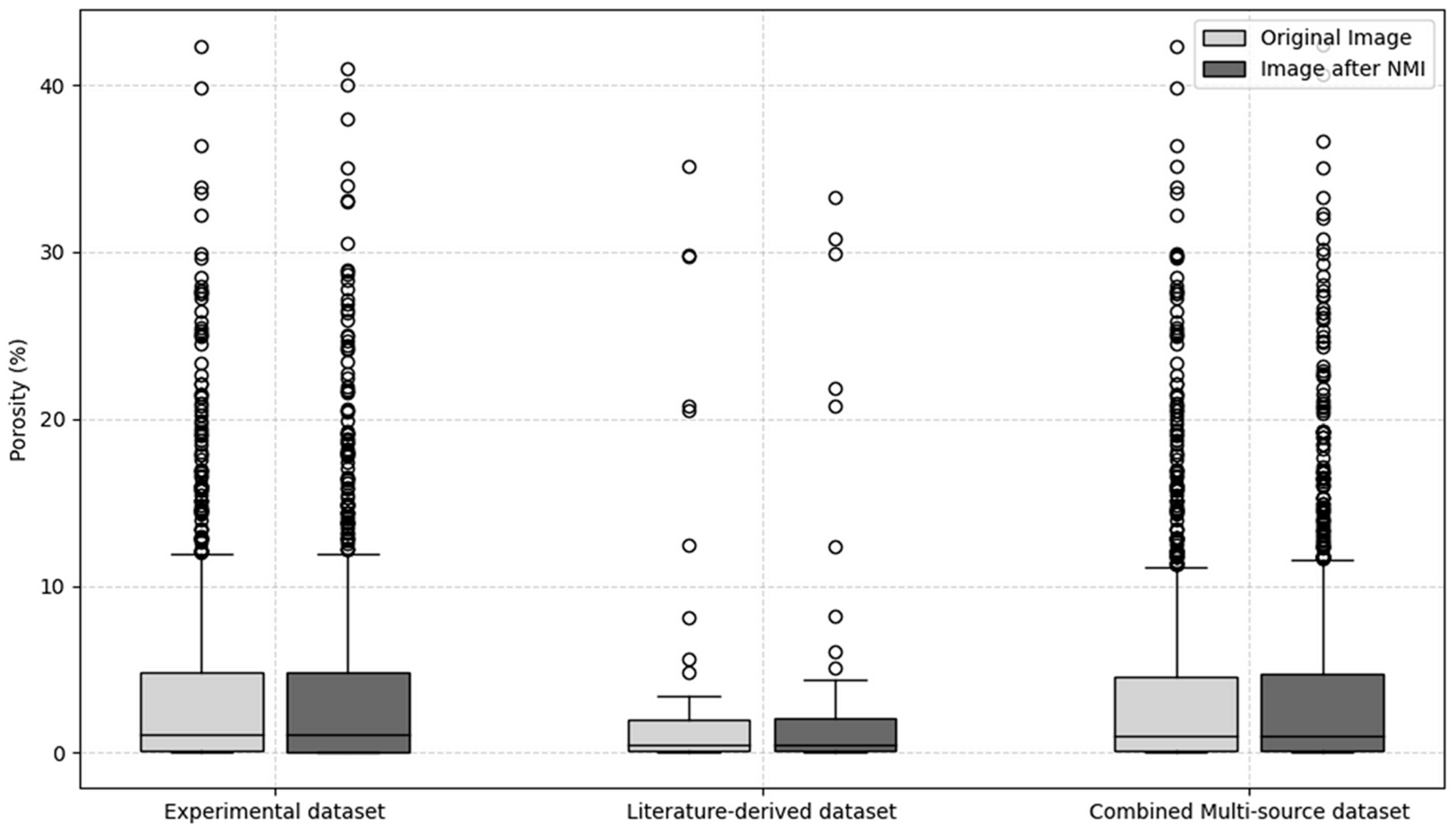 Figure 11. Box plots of image porosity distribution based on NMI-processed and original images applied to the experimental dataset, literature-derived dataset, and the combined multi-source dataset. Small circles represent outliers beyond 1.5 times the interquartile range (IQR) from the box edges.