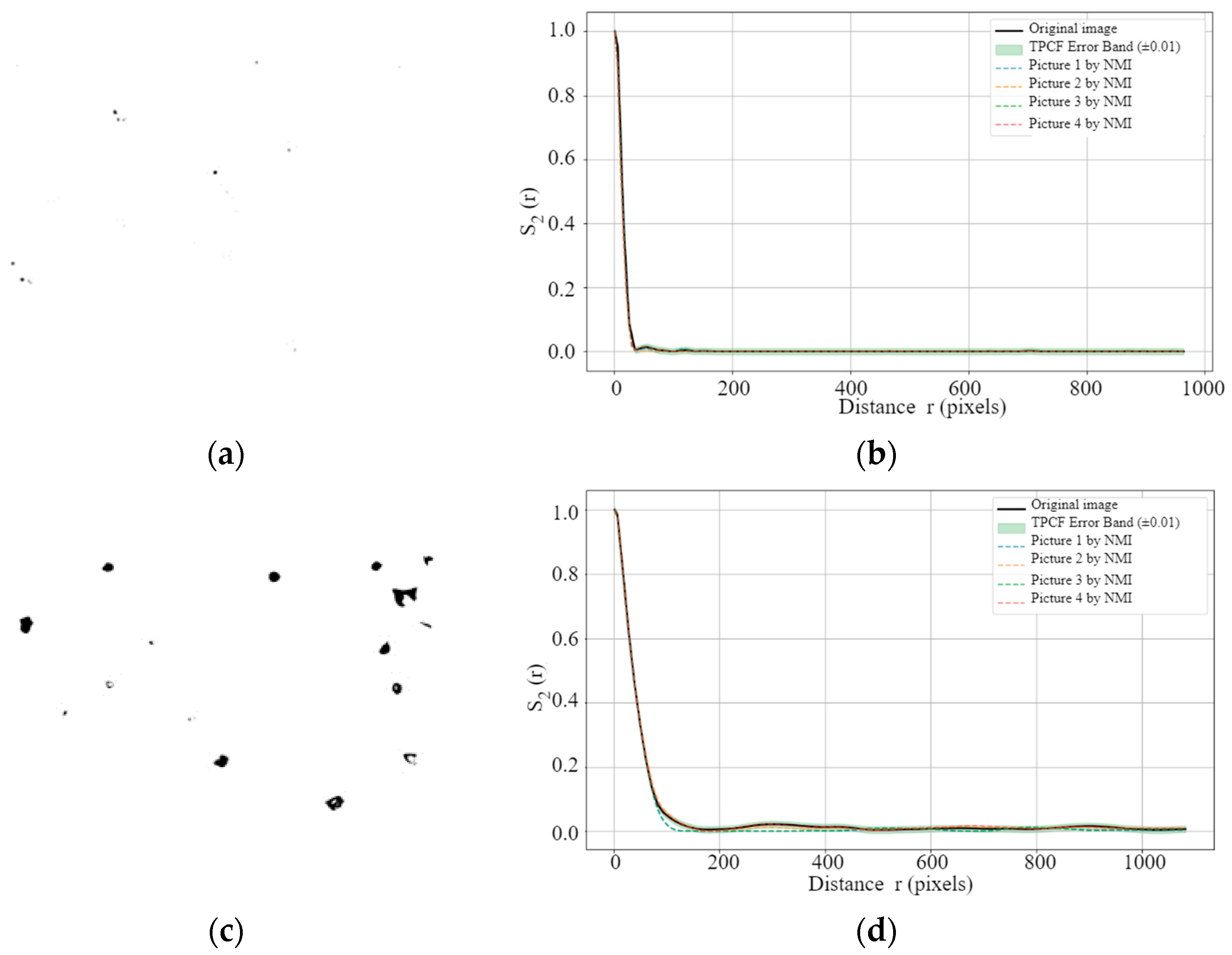 Figure 13. TPCF curves of original and NMI-processed images with three porosity levels. (a,c,e) show the original images with porosities of 0.08%, 0.89%, and 29.75%, respectively. (b,d,f) present the corresponding TPCF curves, where the black line denotes the original image and the colored lines represent the TPCF curves of image groups processed by the NMI method.