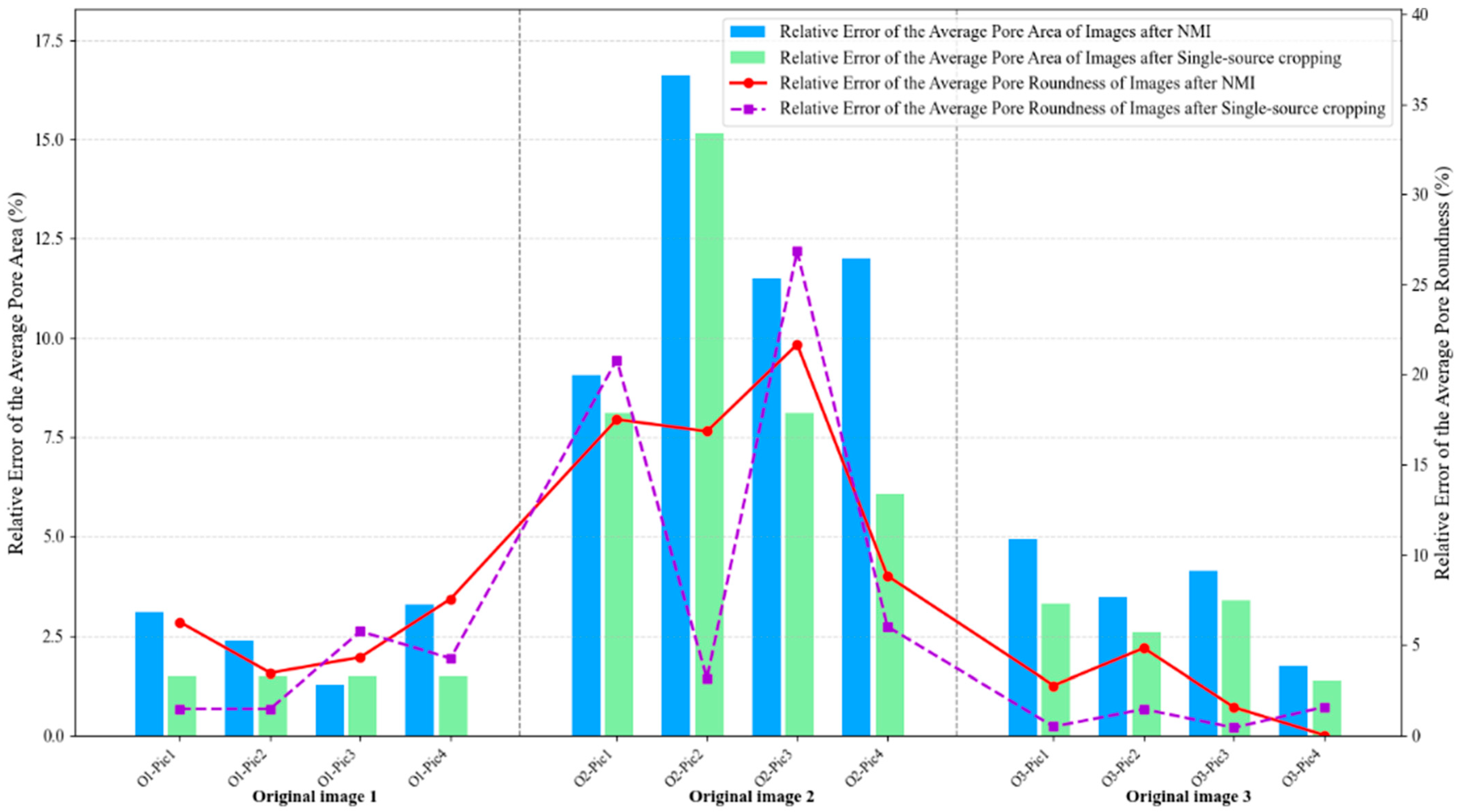 Figure 14. Relative error (compared to original images) in average pore area (bar chart, left Y-axis) and roundness (line plots, right Y-axis) for NMI-processed and single-source cropped images with three porosity levels. For comparison, each original image is processed by two methods (NMI-processed and single-source cropping) to obtain four representative normalized images. The X-axis labels (e.g., “O1-Pic1”) denote the specific processed image, where ‘O1’ refers to Original Image 1 (representing Porosity Level 1) and ‘Pic1’ is the first representative picture derived from that original image after processing.