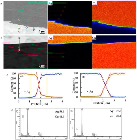The compositional distribution of the interfaces is shown in Figure 4. The differences in interdiffusion performance across the two parts of the interfaces can be found in the EDS mapping (Figure 4a,b). At the 1-Ag/Cu interface, a Cu-containing band was formed in the Ag side, accompanied by a Ag-containing band in the Cu side, and the former is wider than the latter. At the 2-Ag/Cu interface, a Cu-containing band was formed in the Ag side, being much narrower and weaker than that at the 1-Ag/Cu interface. However, on the Cu side, a Ag-containing band was not observed. Moreover, some dots with Cu of greater intensity appear in 1-Ag near the interface, corresponding to the particles in the interface region of 1-Ag. Two particles were indicated by blue circles in the backscattered electron (BSE) image, which were determined by point composition analysis to be Cu-enriched phases (Figure 4d).