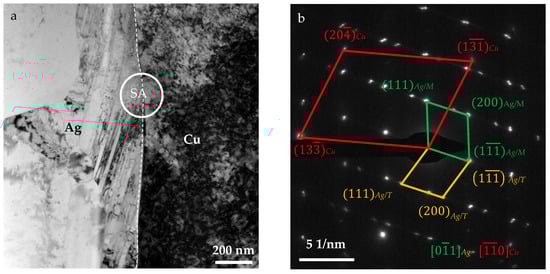 (a) TEM image and (b) SAED pattern of SA (the white circle) at the 1-Ag/Cu interface. The white dashed line shows the 1-Ag/Cu interface.