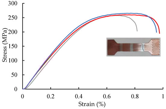 Figure 8 presents the engineering stress–strain curves of the three Ag/Cu composite samples, along with a typical image of the broken samples. The average yield strength, tensile strength, and elongation are 113 ± 2 MPa, 260 ± 5 MPa, and 0.92% ± 0.08%, respectively. Obvious drops appear at the end of the stress–strain curves, suggesting the shrinkage of the fracture surface. All three tensile samples fractured in the Ag layer rather than at the Ag/Cu interface (inset in Figure 8), implying that the Ag/Cu interfacial bonding strength surpasses the tensile strength of the Ag layer.