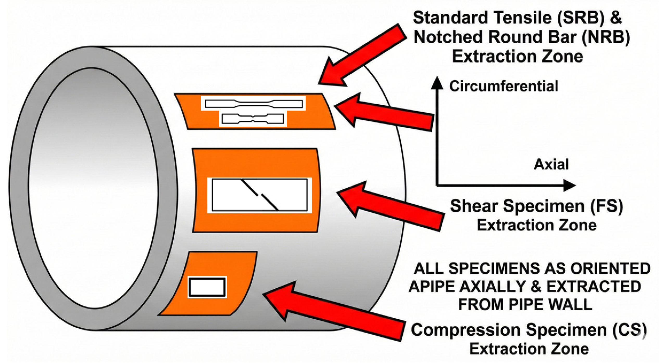 All specimen material was taken from the axial direction of an in-service L360QS natural gas pipeline (outer diameter 406.4 mm, wall thickness 12.5 mm), as shown schematically in