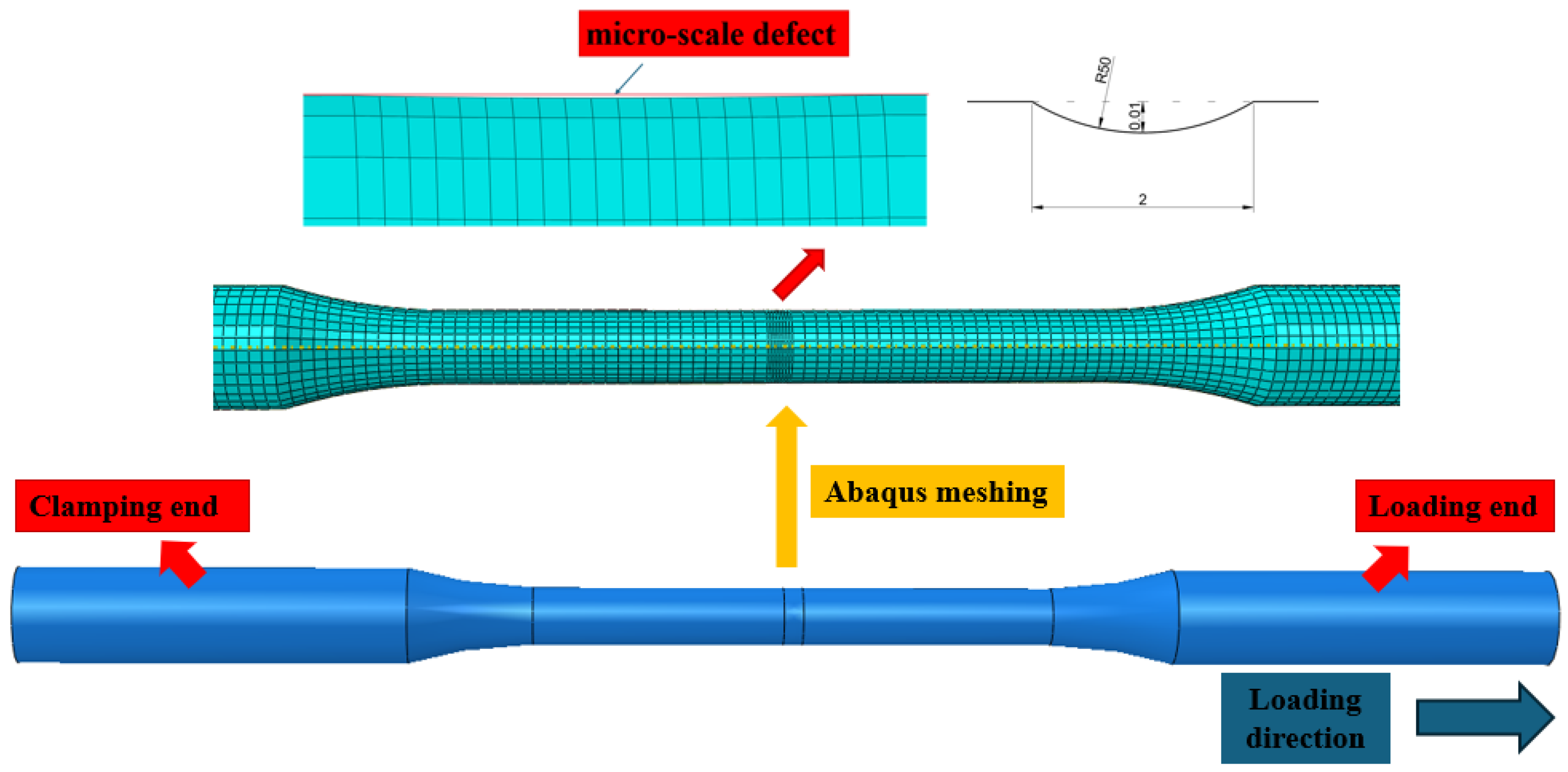 ABAQUS software (version 2023) was used to model the specimens at a 1:1 scale. Eight-node C3D8R solid elements were selected. To induce necking at the specimen’s midsection, a 2 mm-long and 0.01 mm-deep arc indentation with a radius of 50 mm was introduced at the center. Local mesh refinement was performed around the indentation, with one end of the specimen constrained and a displacement boundary condition applied at the opposite end, as illustrated in